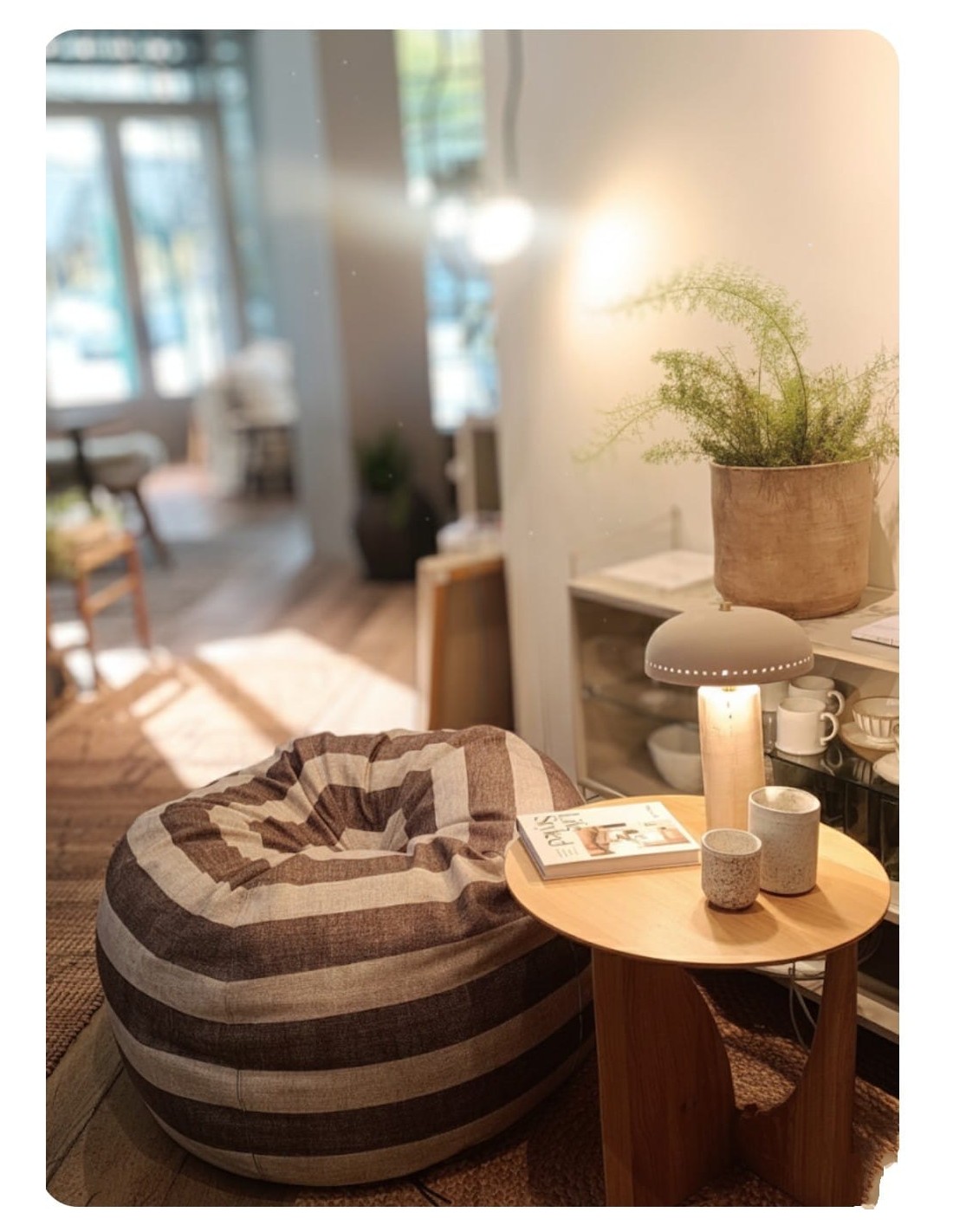 Con su patrón Bayadère de rayas elegantes, el Pouf Bulle Outdoor encarna la filosofía de Maison de Vacances: vivir rodeados de belleza natural, comodidad y autenticidad, sin distinción entre interior y exterior.