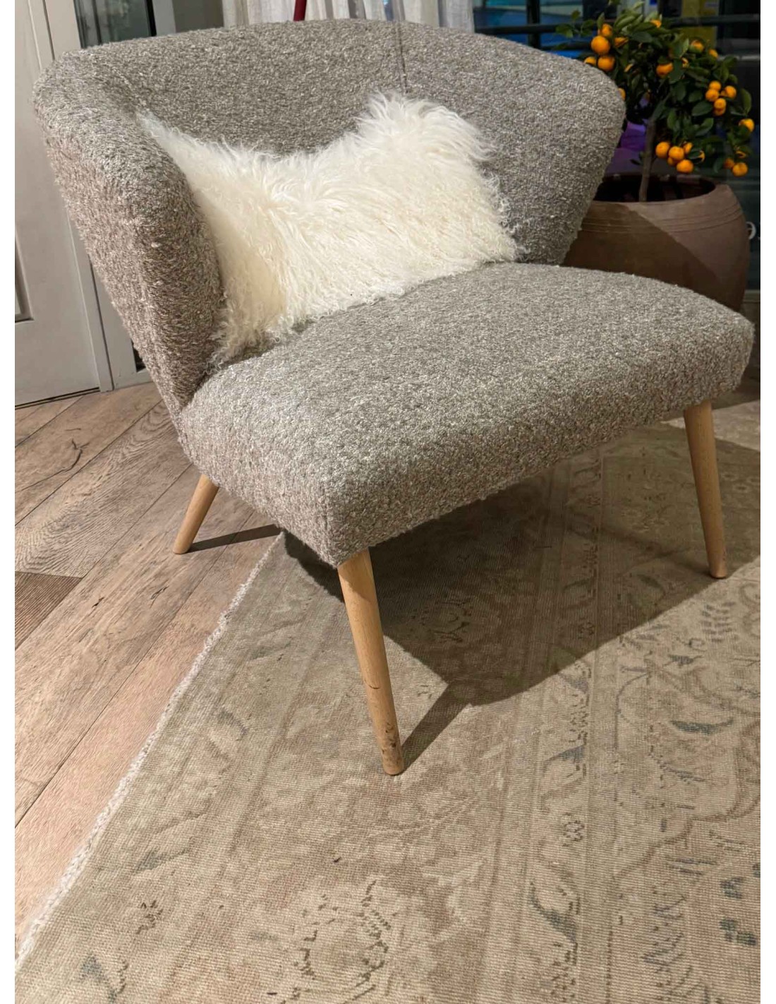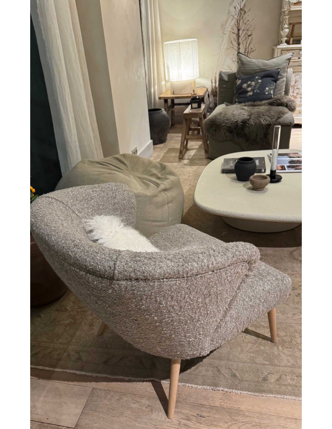 Butaca de líneas redondeadas inspirada en los años 50 y 60. Estructura de madera maciza, respaldo curvo y asiento confortable con foam ignífugo. Fabricada artesanalmente en España.