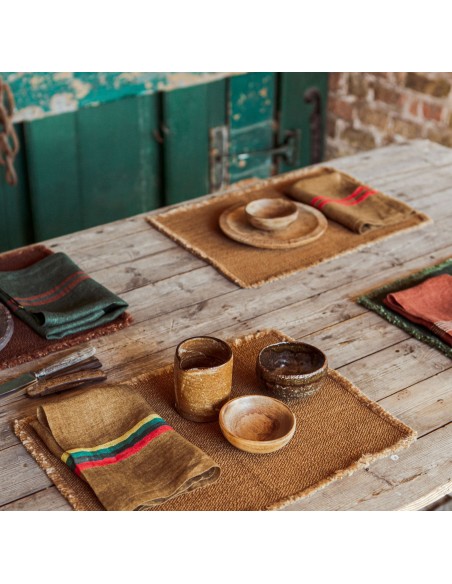 Disponible en colores suaves y matizados, se puede combinar por tonalidad o mezclar para componer mesas más expresivas. El tejido, denso y de tacto orgánico, está pensado para envejecer con belleza y acompañar comidas cotidianas o celebraciones especiales.