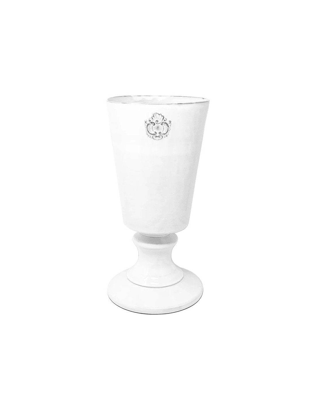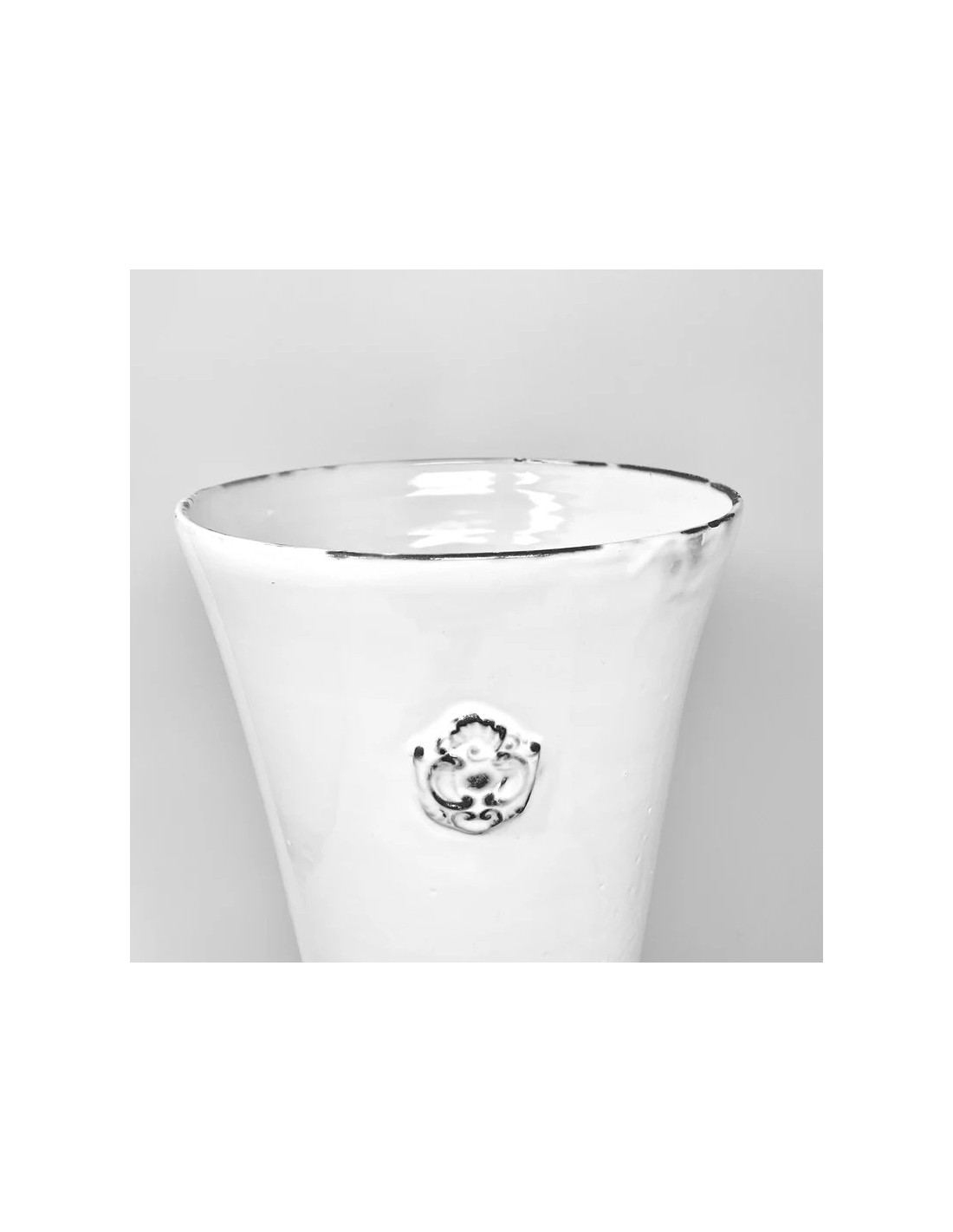 Un jarrón con pedestal de cerámica artesanal, con un distintivo relieve en su base. Ideal para flores, postres o como pieza decorativa en cualquier espacio. Hecho a mano en Francia con arcilla terracota negra esmaltada en blanco lechoso, combina carácter, textura y elegancia natural. Diseño de Mathilde Carron-Astier de Villatte.