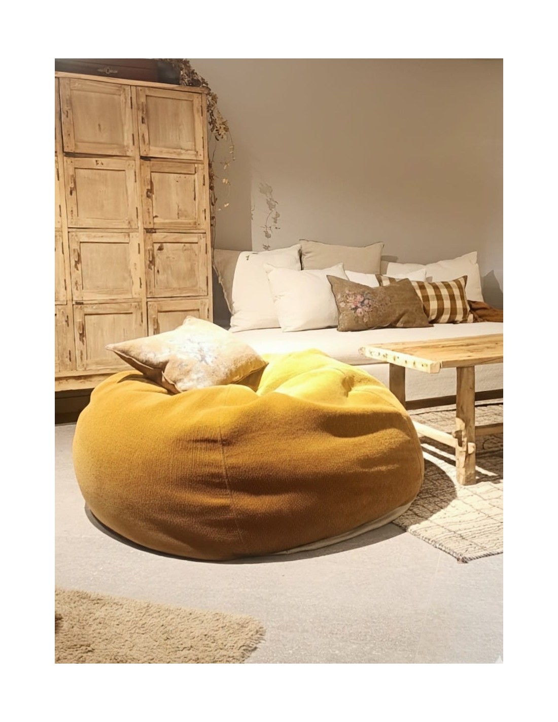 Pouf Bulle en tejido vintage chenille color curry de Maison de Vacances. Hecho en Francia con lino, viscosa, algodón y poliéster. Suave, cómodo y artesanal.