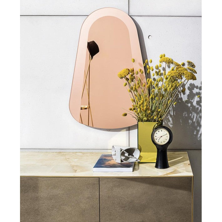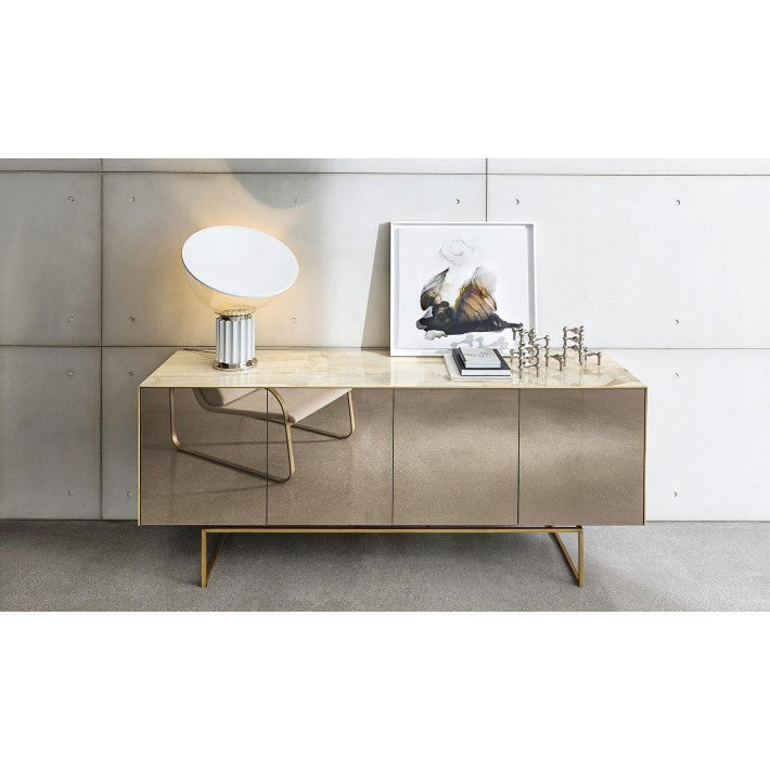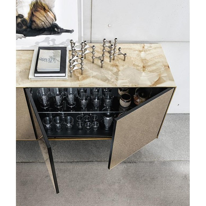 Magda es una nueva colección de aparadores que combina la materialidad y las suaves vetas de la cerámica efecto mármol con los preciosos y fascinantes tonos de los espejos Sovet.