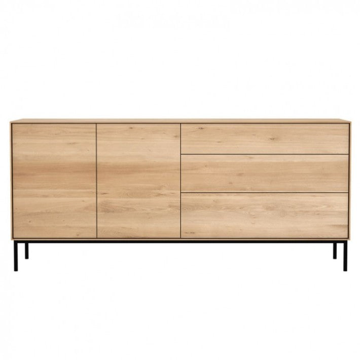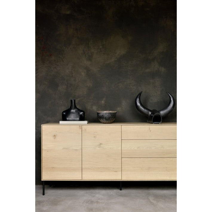 Para la colección Whitebird, el diseñador Alain Van Havre une elementos opuestos, combinando suaves patas redondas y llamativas líneas gráficas en diseños ligeros, simples y elegantes. El aparador Whitebird Roble tiene tres puertas. También disponible en negro, colección Blackbird.
