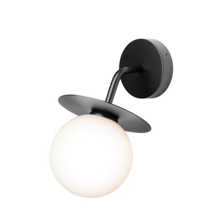 Esta lámpara de pared está compuesta por una estructura metálica negra con una fina placa circular que sostiene una esfera de vidrio soplado a mano en acabado opal blanco. La luz se refleja suavemente a través del vidrio, creando un ambiente cálido y acogedor, perfecto para zonas exteriores que buscan funcionalidad sin renunciar al diseño.