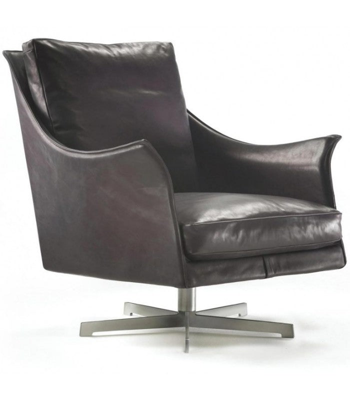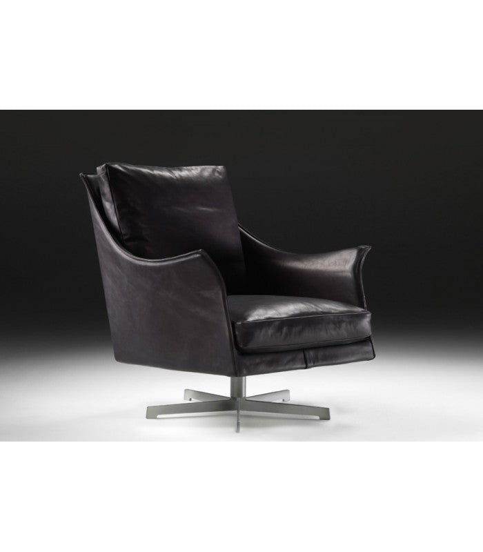 La butaca Boss de Flexform tiene estructura de metal con relleno de poliuretano y dacron revestido de tejido protector. Pies satinados, cromados brunito o cromo negro de cuatro patas o base giratoria. Cojines de pluma y tejido en tejido o piel desenfundable.