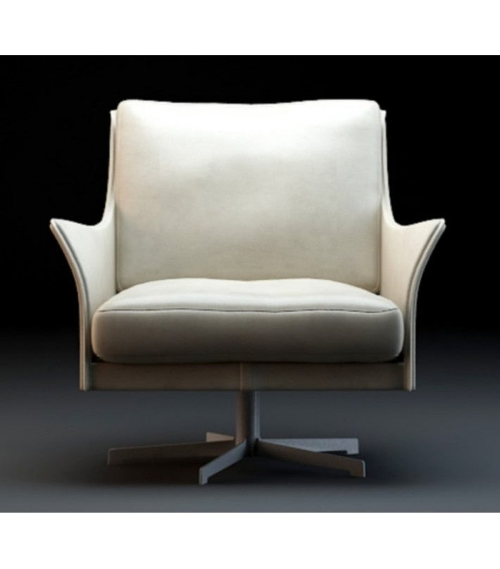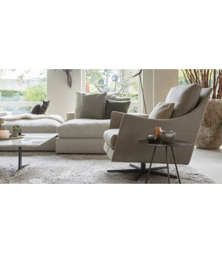 Estructura de metal con relleno de poliuretano y dacron revestido de tejido protector. Pies satinados, cromados brunito o cromo negro de cuatro patas o base giratoria. Cojines de pluma y tejido en tejido o piel desenfundable.