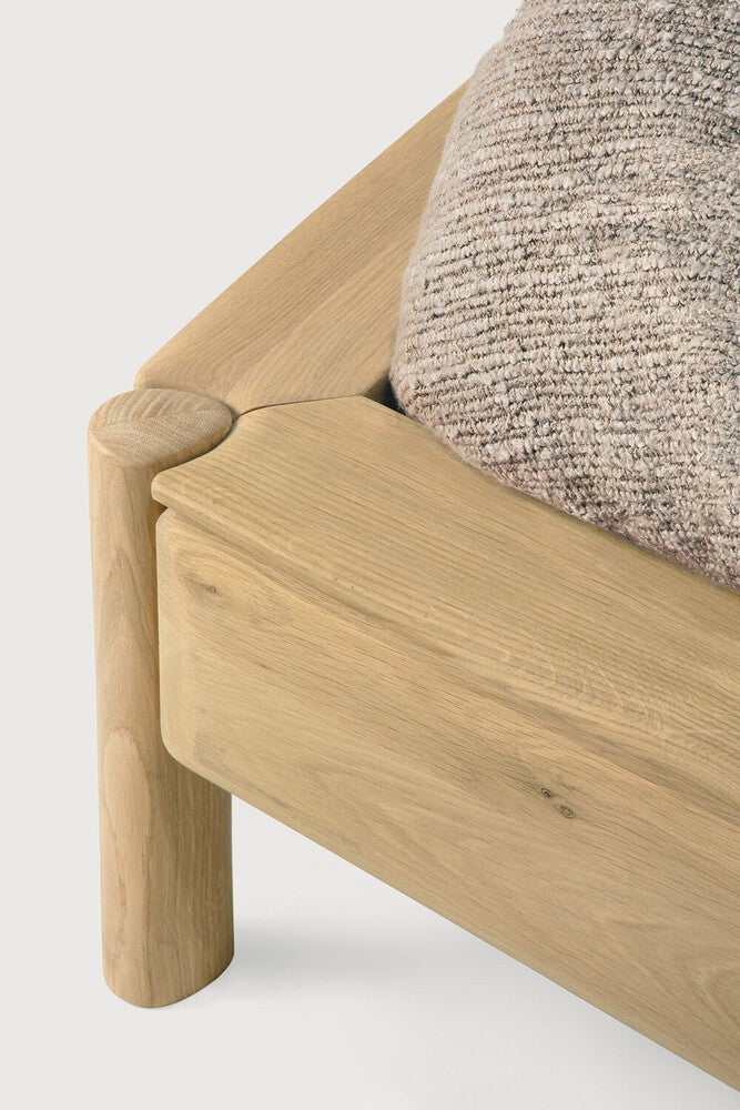 La cama PI rinde homenaje a las formas orgánicas de la naturaleza, integrando la suavidad de las curvas con la fuerza atemporal del roble macizo. Cada pieza revela una elegancia imperfecta, con acabados pulidos a mano que conservan el carácter único de la madera. El cabecero tapizado en tono cloud aporta un suave contraste visual y táctil, enriqueciendo la composición con un aire contemporáneo y sofisticado.