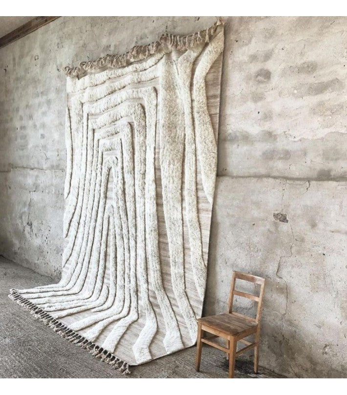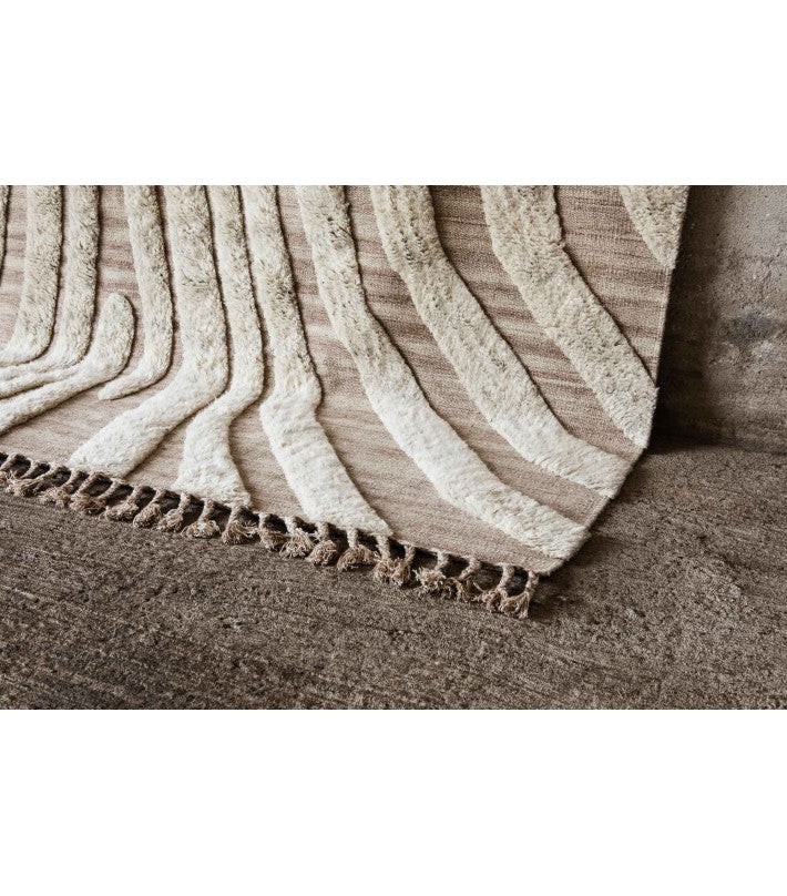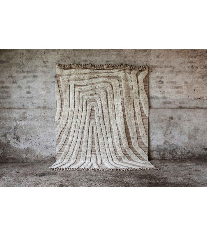 No.02 es una alfombra decorativa anudada a mano en lana natural. El patrón suave e irregular crea una sensación vívida e intrigante. La alfombra es de lana 100% natural y sin blanquear en un suave blanquecino. Un borde de flecos largo eleva la línea de fondo y agrega un detalle artístico y étnico.