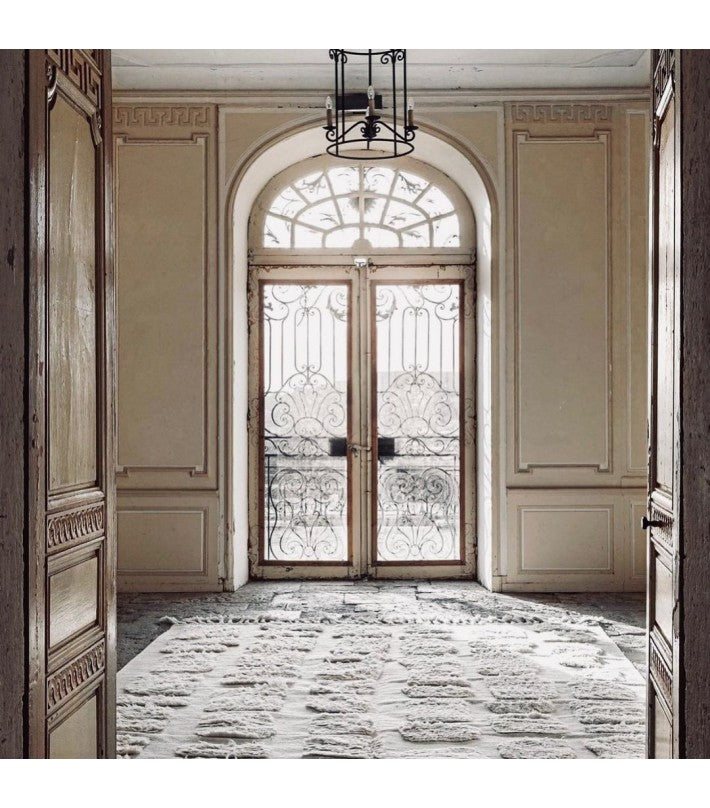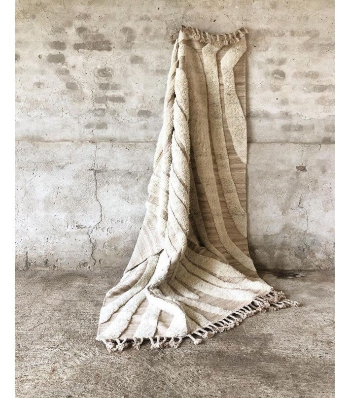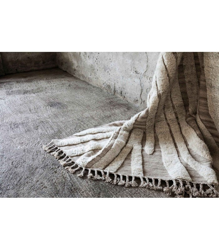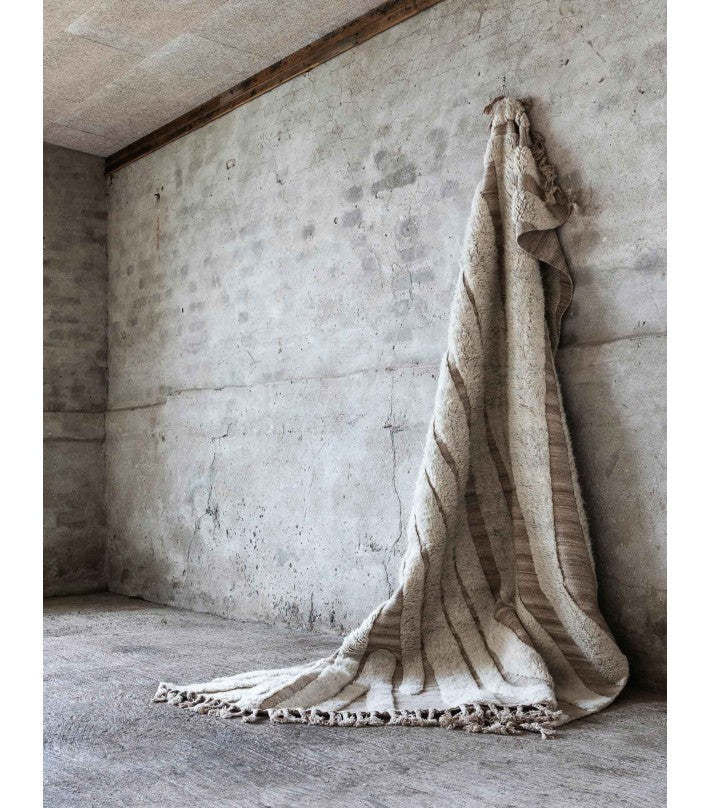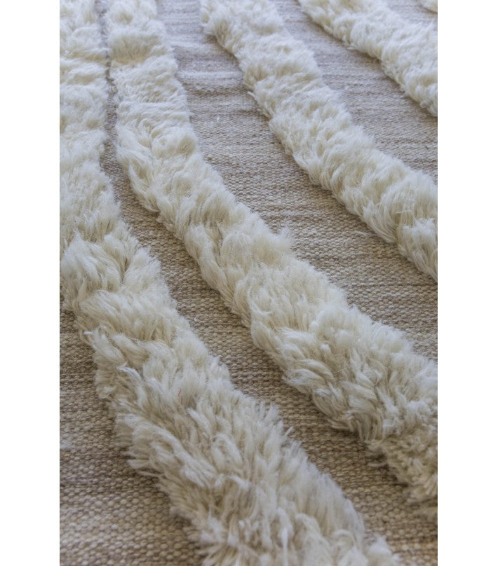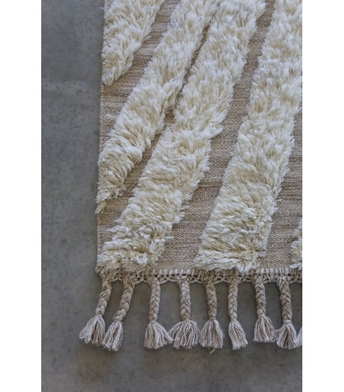 No.02 es una alfombra decorativa anudada a mano en lana 100% natural y sin blanquear en un suave blanquecino. Un borde de flecos largo eleva la línea de fondo y agrega un detalle artístico y étnico. Cualquier variación de color o detalle es el resultado de la naturaleza artesanal de este artículo y hace que cada pieza sea única.