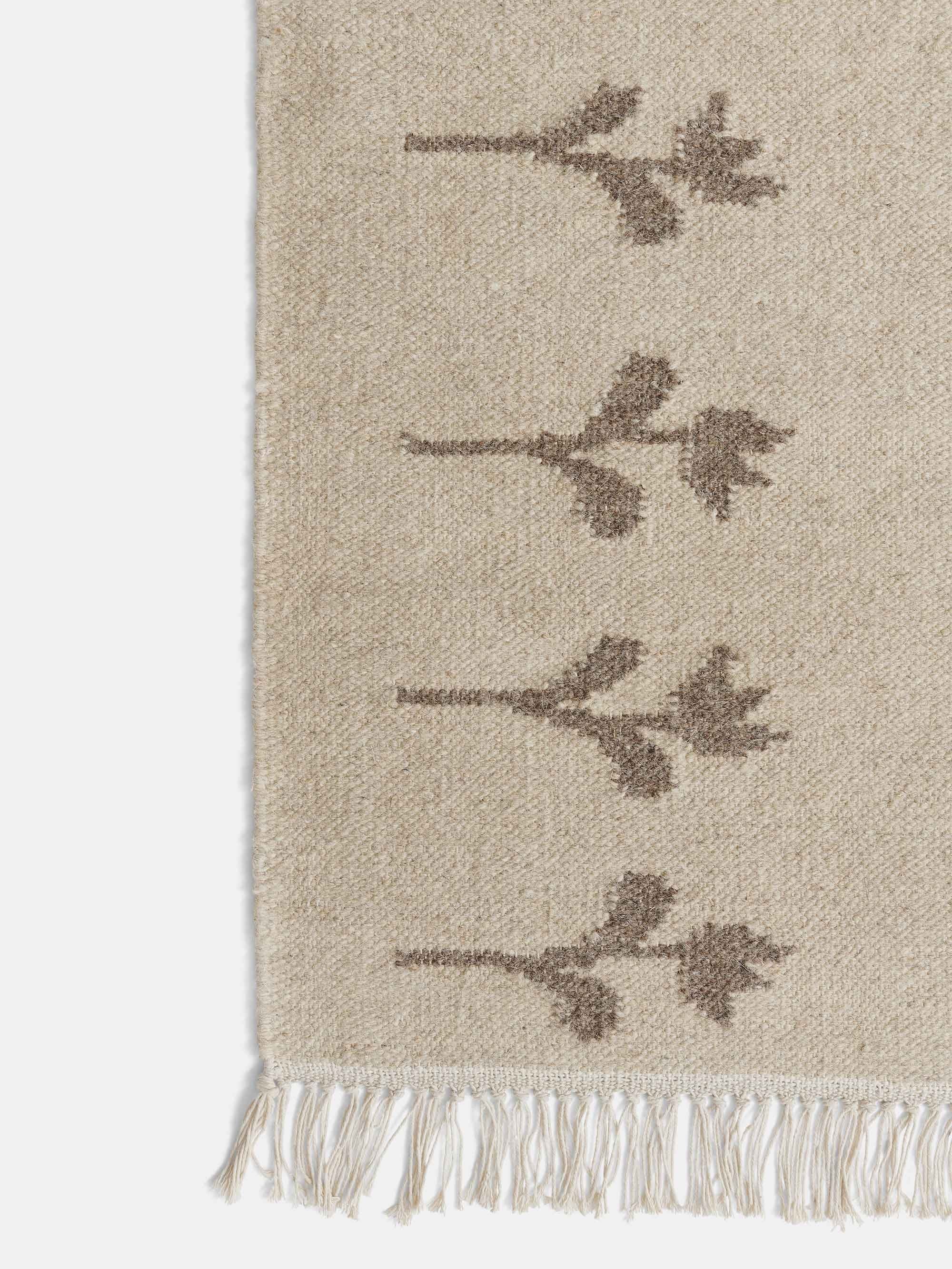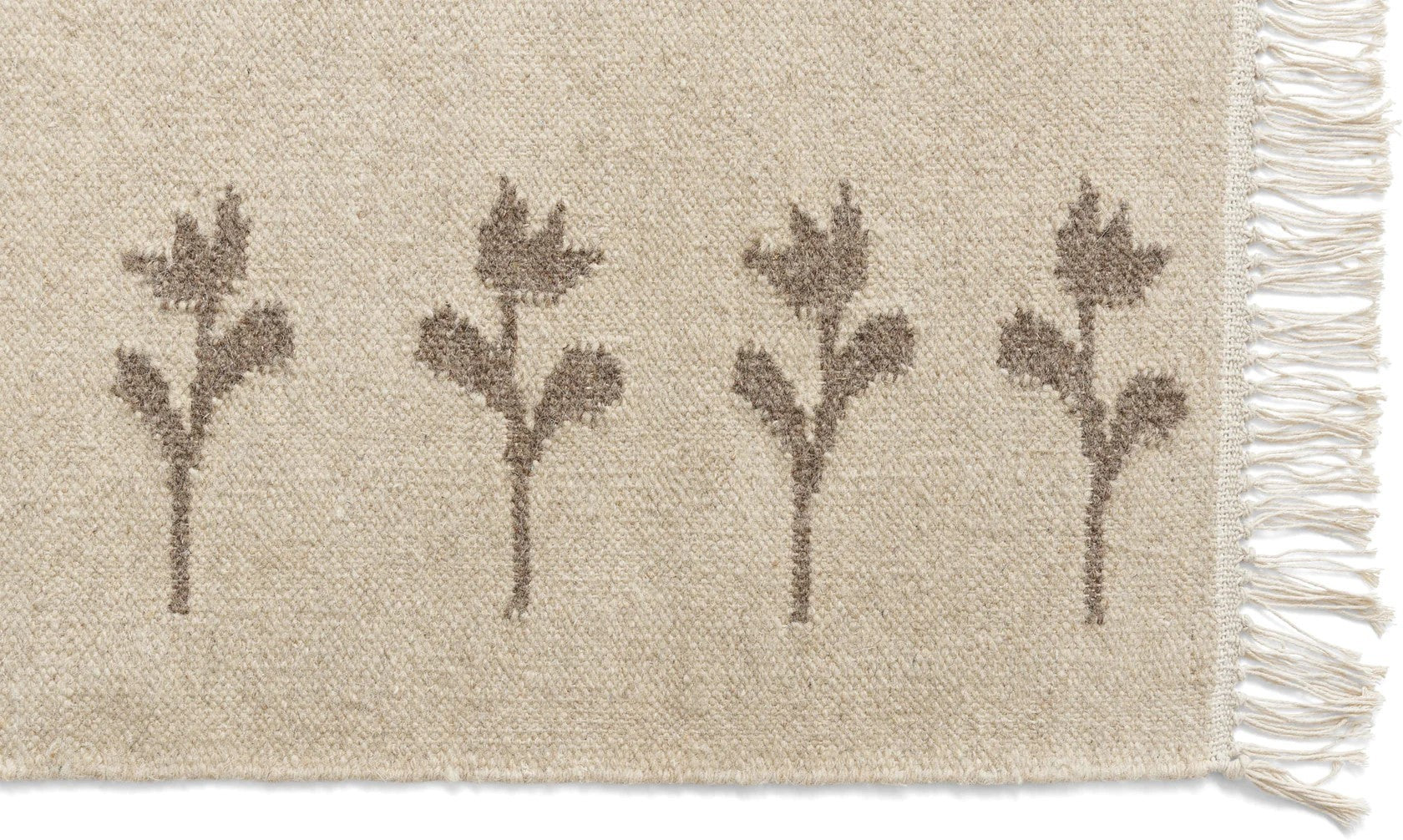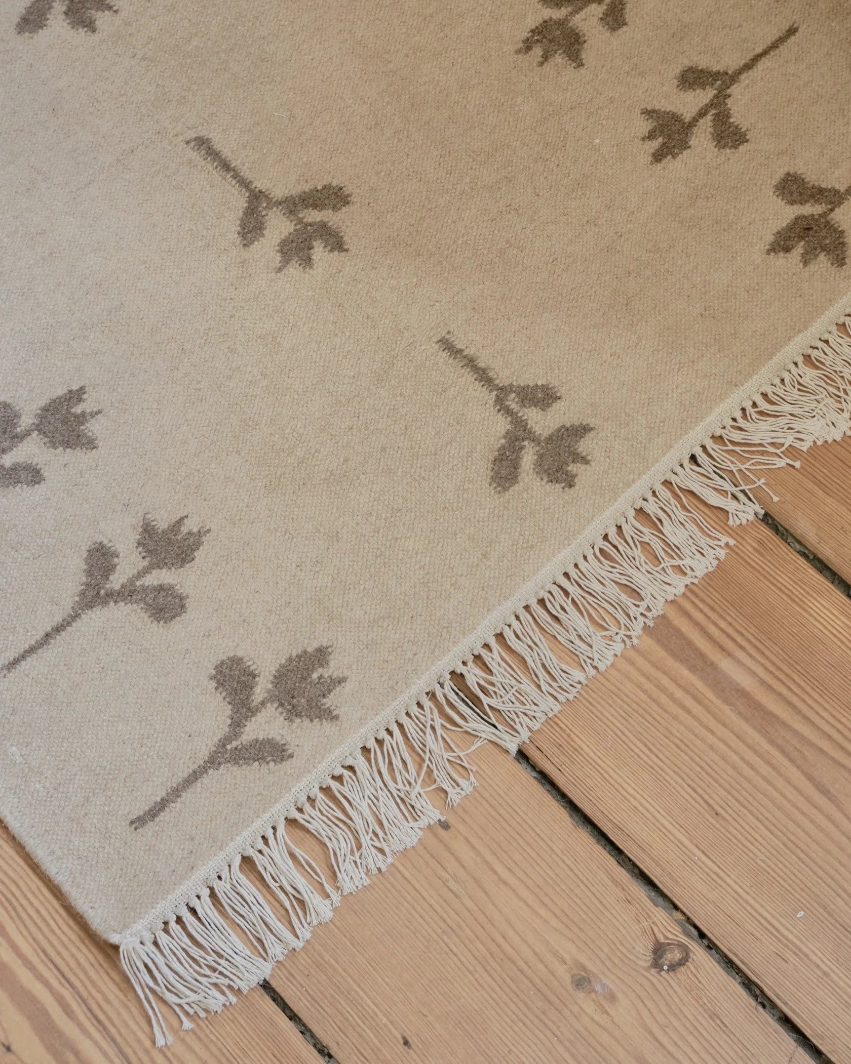 La Alfombra No.17 es una pieza ligera y tejida a mano, confeccionada en lana natural. El diseño de la alfombra presenta una base de color beige medio con flores tejidas en tono marrón suave, creando una impresión natural. Las flores están inspiradas en antiguos patrones de tulipanes escandinavos que tradicionalmente adornan desde la porcelana hasta alfombras y cortinas. Una fina fila de flecos decora los bordes, proporcionando un detalle sencillo pero importante para el diseño general.