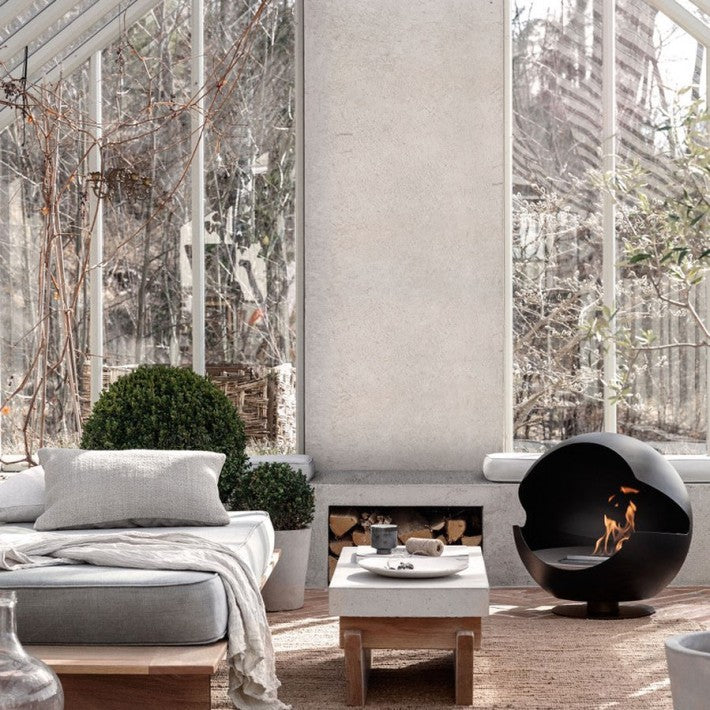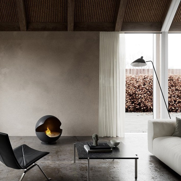 Globe es una chimenea de bioetanol independiente y sin humo que no requiere instalación. Esto significa que se puede girar fácilmente para apuntar la abertura en la dirección en la que desea que se emita el calor.