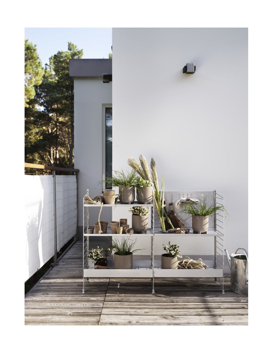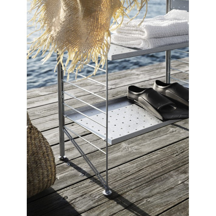 La estantería autoportante de String® System diseñada para uso en exteriores se adapta a la perfección a terrazas y balcones grandes y pequeños. La estantería es completamente independiente pero, si lo desea, se puede asegurar a la base sobre la que se coloca. Una sección completa de la estantería autoportante se compone de un panel trasero, dos soportes verticales y dos paneles de suelo galvanizados con una altura de 85 cm y una profundidad de 30 cm.