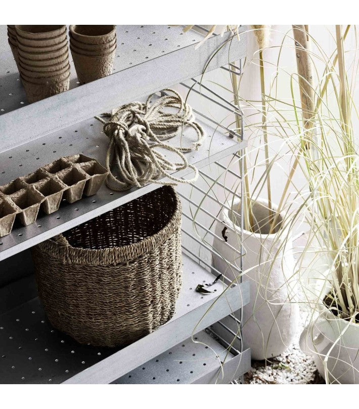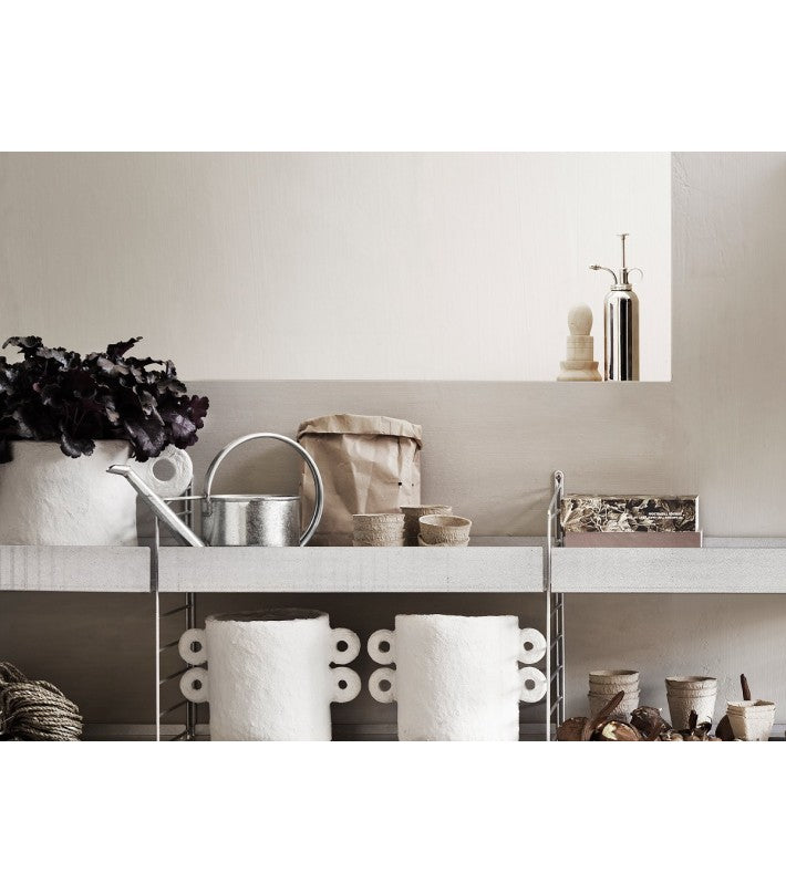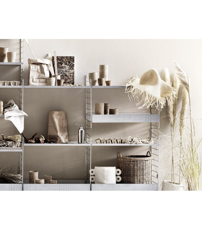 Estantería de pared de String® System con tres secciones para almacenamiento. El estante de pared se adapta perfectamente en el dormitorio, al aire libre, armario o en el pasillo donde se necesita mucho espacio de almacenamiento.