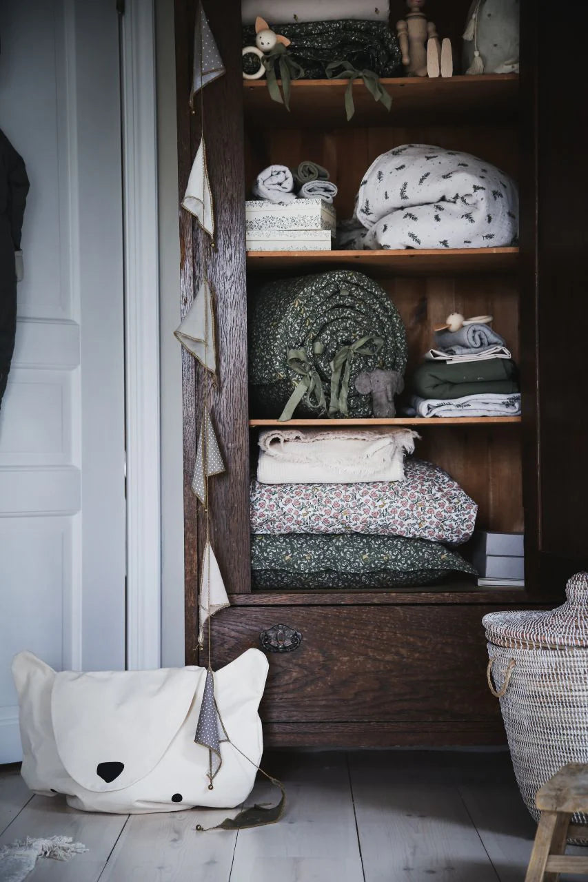 En nuestro patrón Floral Moss la base es un verde musgo oscuro con pétalos y hojas blanquecinas en dos tonos de verde claro. Nos encanta. Las fundas de cama Garbo & Friends están rellenas de polyfill hipoalergénico. El lado estampado está hecho de percal 100% algodón, y el lado sólido del reverso está hecho de un algodón percal de color sólido complementario.