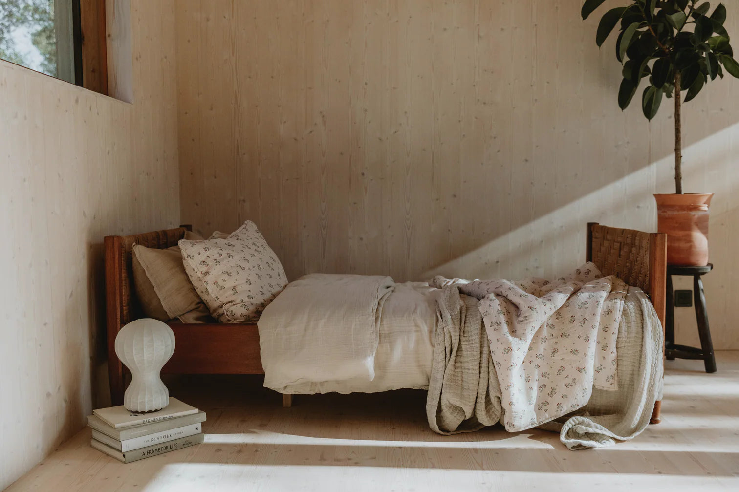 La muselina es un material suave celestial con una textura hermosa que generalmente se usa para mantas envolventes, por lo que pensamos por qué no hacer juegos de cama con este material que se volverán más y más suaves con cada lavado. Utilizamos una muselina de algodón 100% ligera y aireada de primera calidad con cierre de botón.