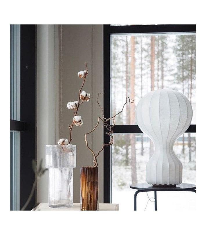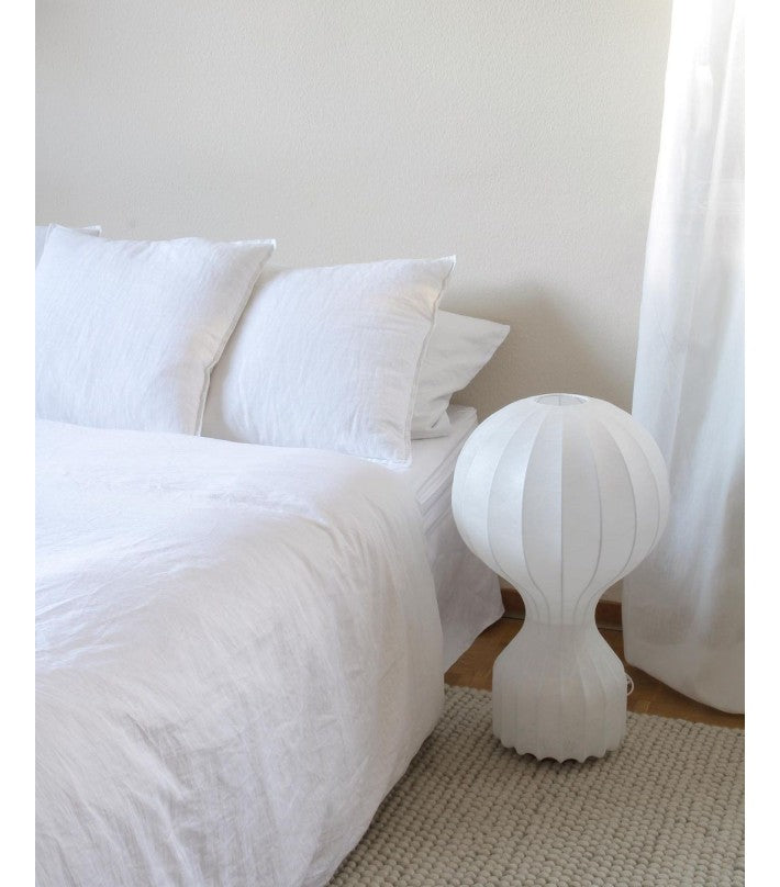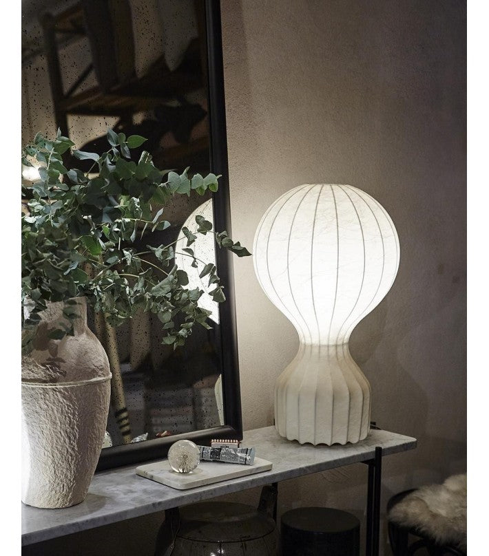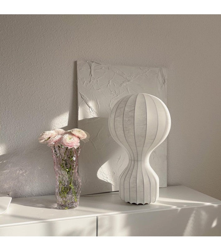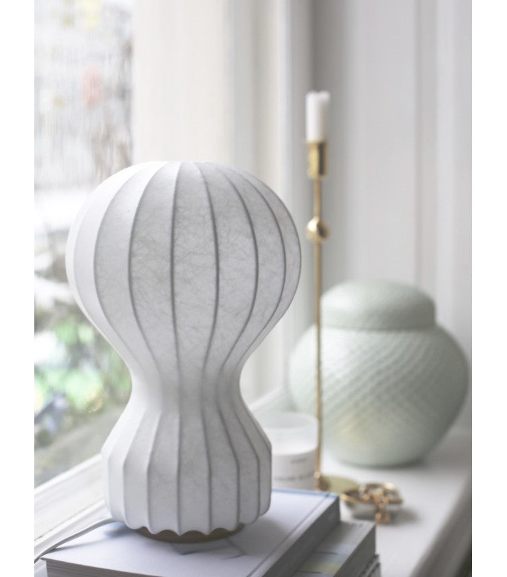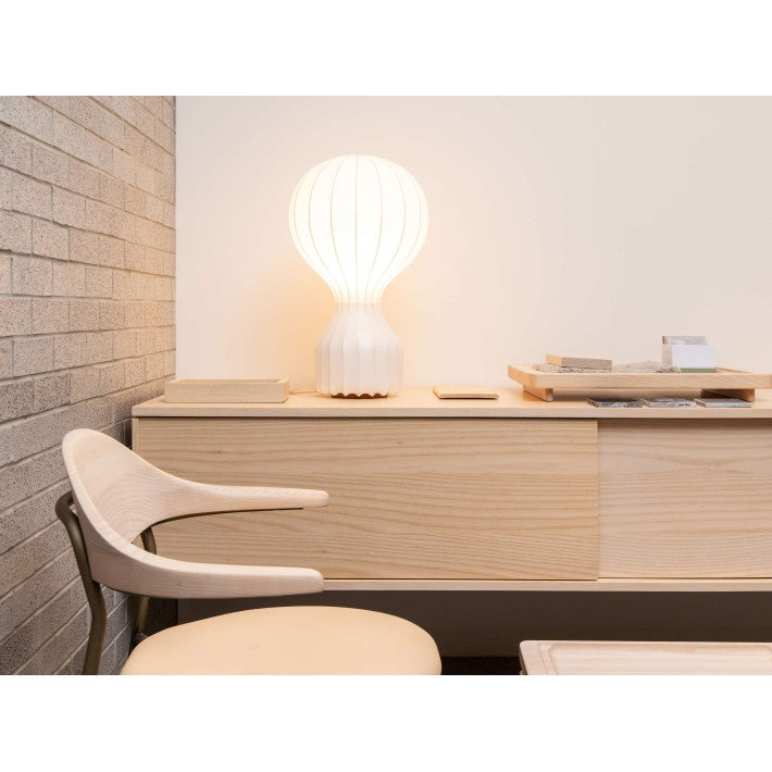 Lámpara de sobremesa de luz difusa. En el cable de encuentra el regulador electrónico que permite regular el brillo de la luz.