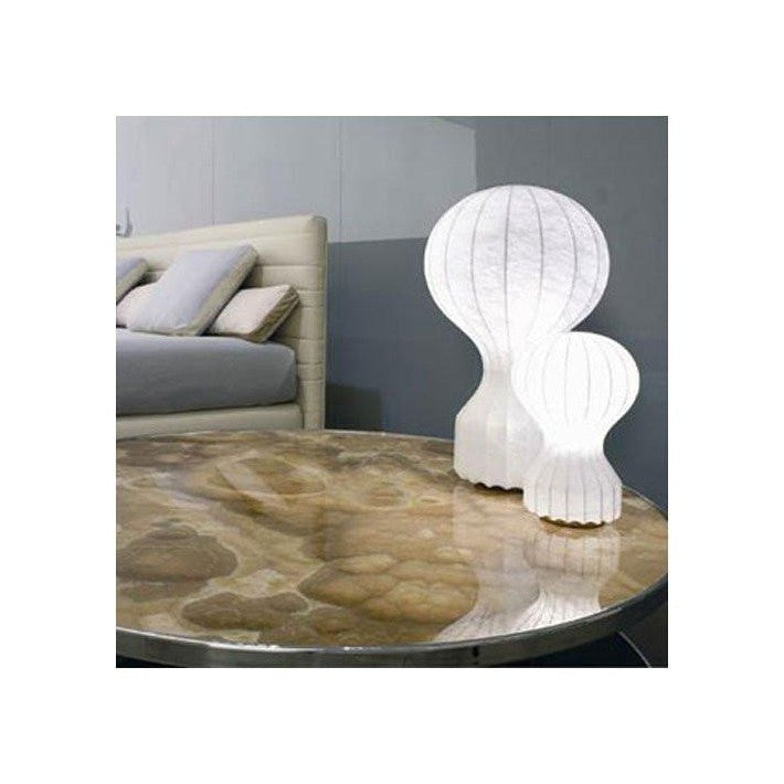 Lámpara de sobremesa de luz difusa. En el cable de encuentra el regulador electrónico que permite regular el brillo de la luz. Estructura interna de acero pintado en polvo blanco. Pantalla de resina "cocoon" pulverizada sobre la estructura, con película protectora transparente pulverizada al final.