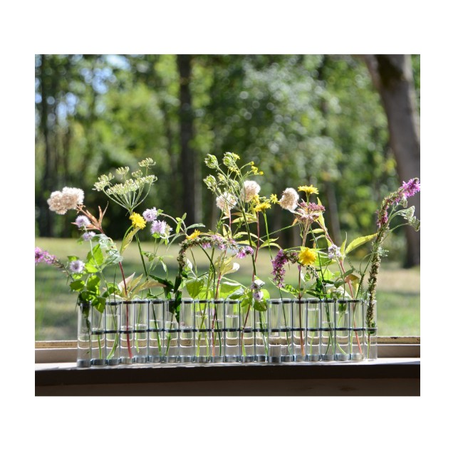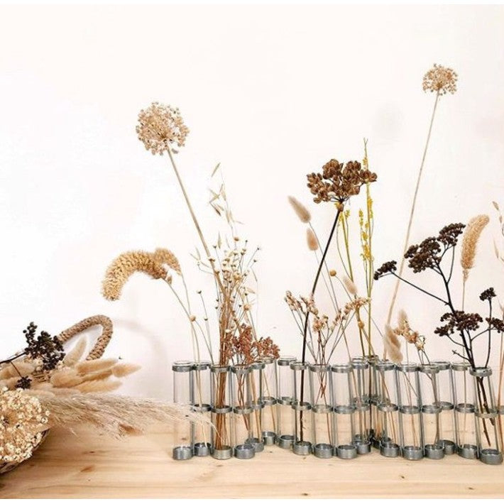 Inspirado en el arte japonés del ikebana, este jarrón celebra la belleza de las flores aislando cada tallo en su propio tubo de vidrio, permitiendo composiciones ligeras, dinámicas y llenas de poesía.
