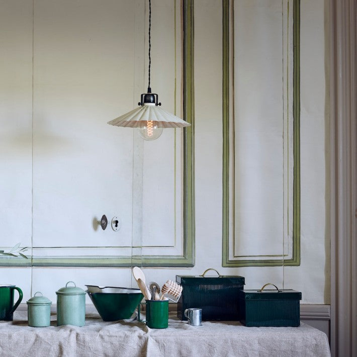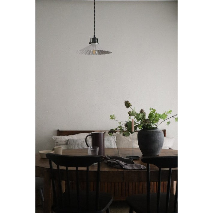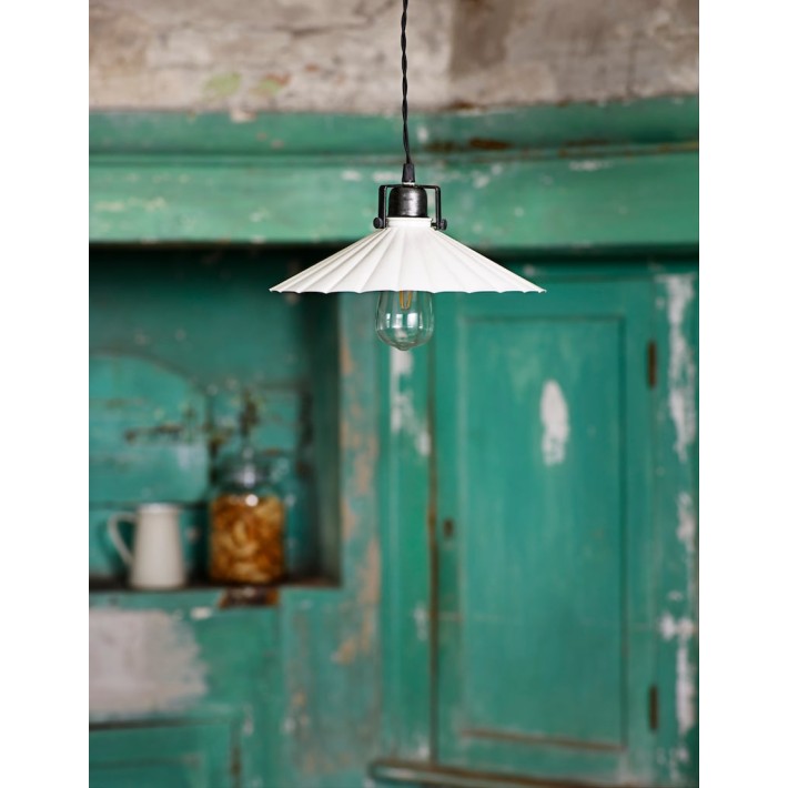 Lámpara colgante decorativa con una pantalla de lámpara de metal lacado en blanco con acabado antiguo. Cordón textil negro, longitud aproximada de 150 cm.