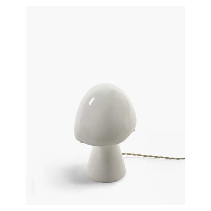 La lámpara de mesa "Joe n°2" en color blanco aporta un toque de encanto nostálgico, inspirado en las formas orgánicas de hongos de los años 60. Es perfecta para la habitación de un niño, pero lo suficientemente versátil como para encajar en cualquier estancia. La porcelana de hueso translúcida emite una luz suave y envolvente tanto en la base como en la pantalla de la lámpara. Con un acabado que incluye un cordón de tela dorado y un interruptor, la "Joe n°2" añade una elegancia lúdica a cualquier interior.
