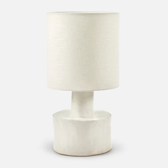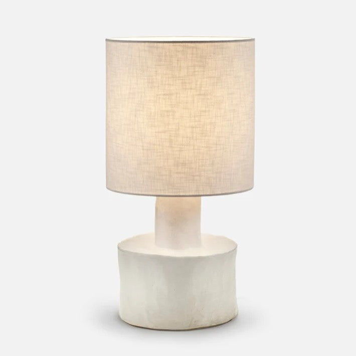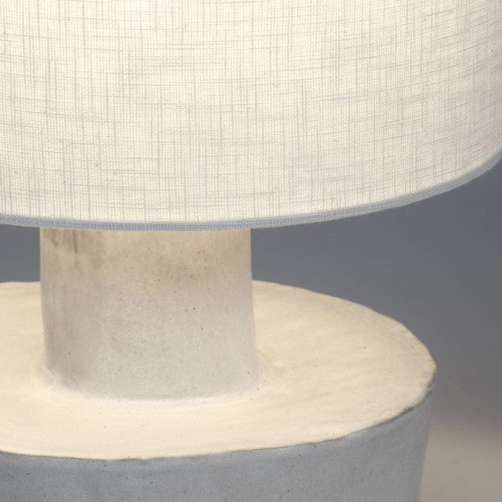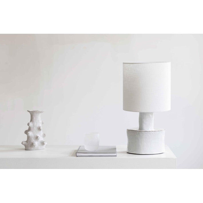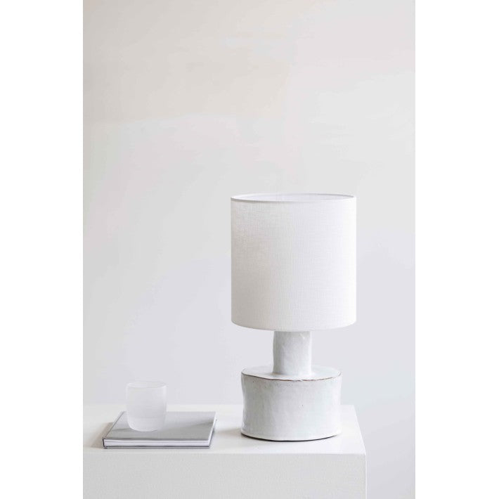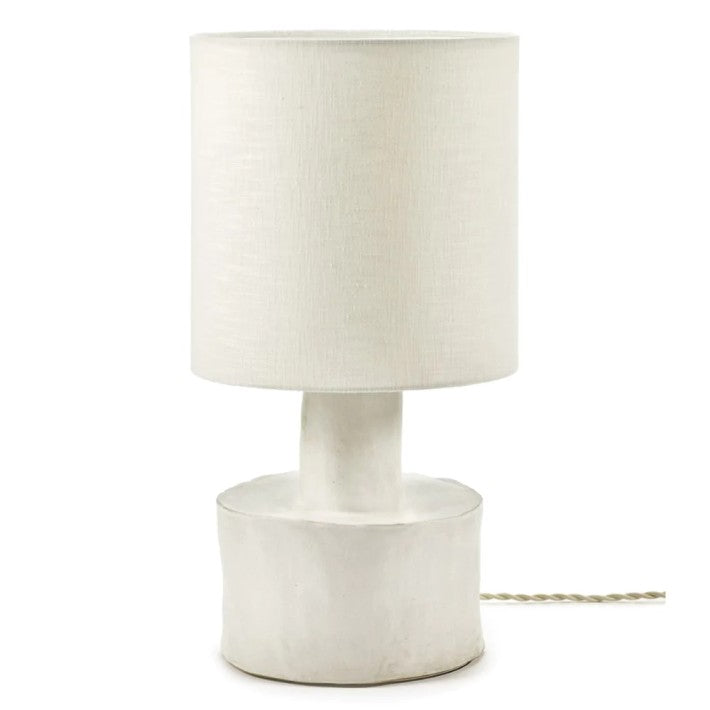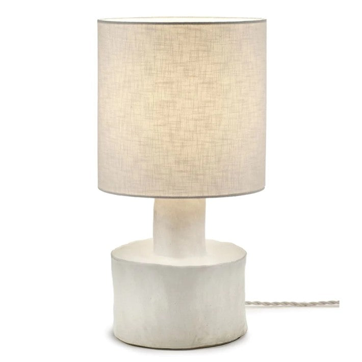 Lámpara de mesa Catherine, creada por la diseñadora Marie Michielssen para la marca Serax. Su base cerámica soporta un tono de lino blanco que difunde una luz cálida y ambiental. Obtenemos así una mezcla de texturas que le da a esta lámpara un aspecto moderno y la hace muy versátil. Gracias a su estética sofisticada, este objeto funcional se convierte en un objeto decorativo y completa su interior con estilo