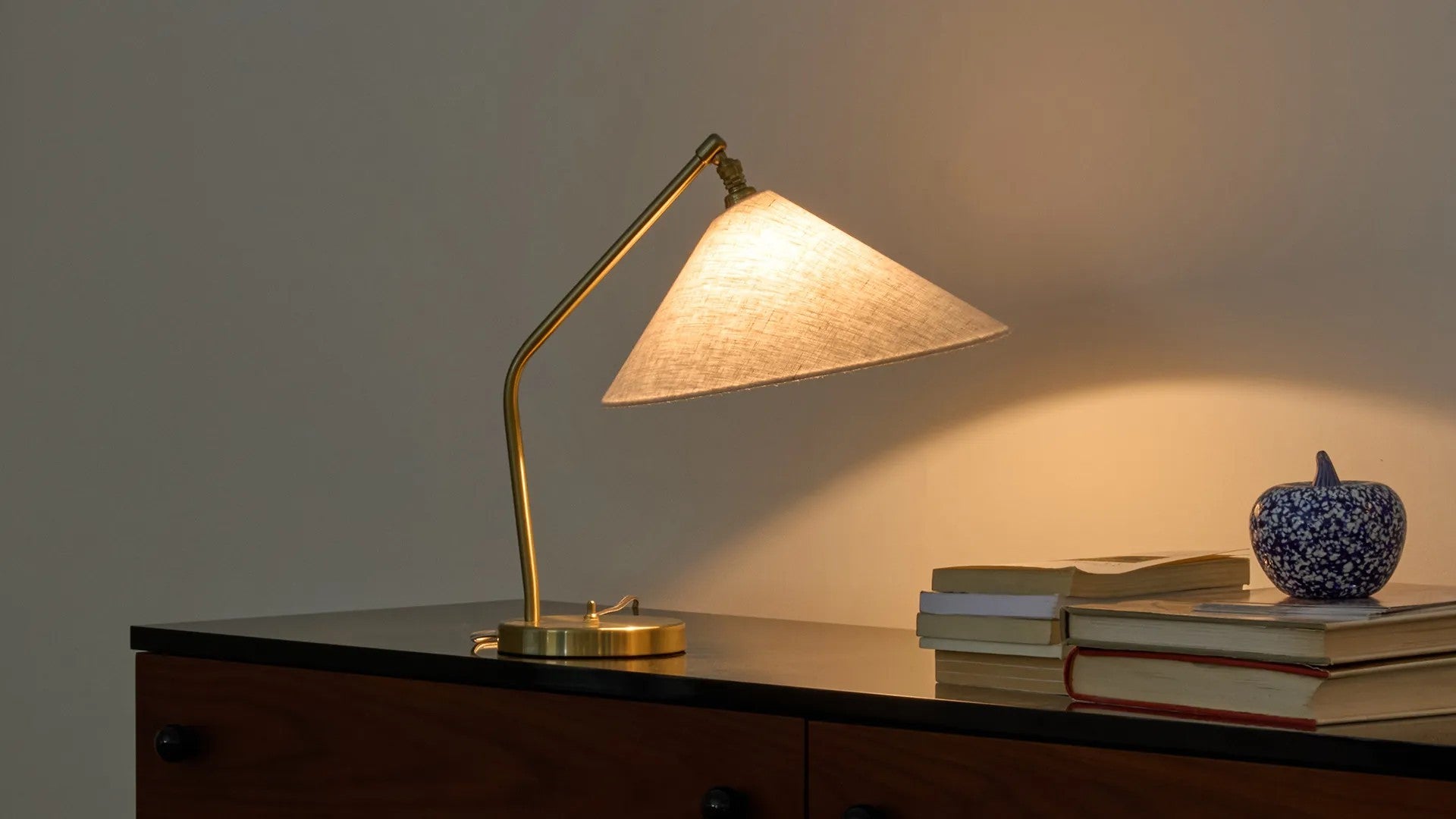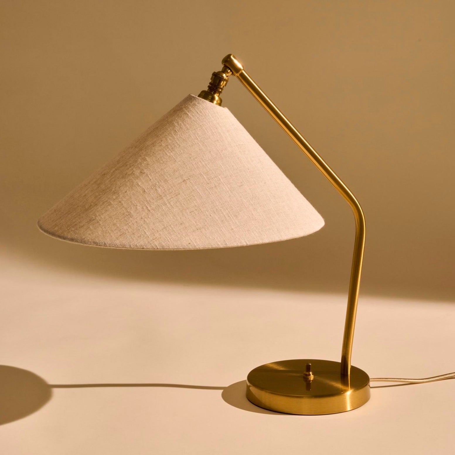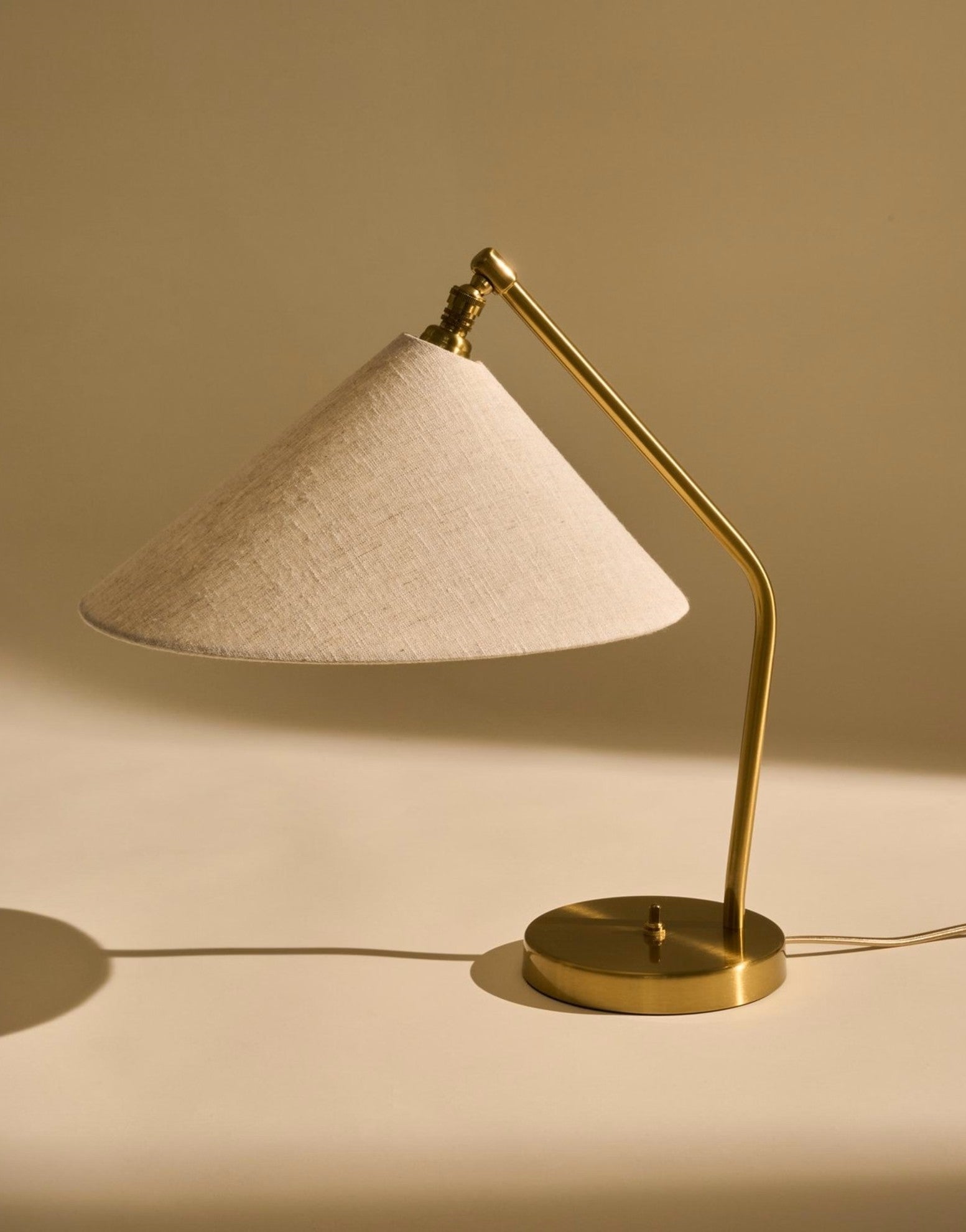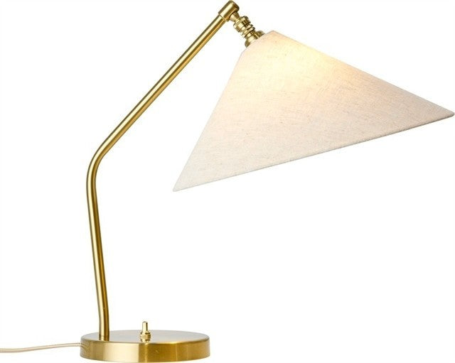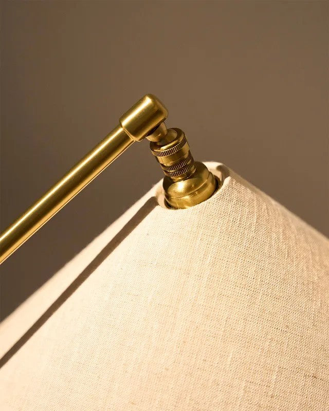 La pantalla de tela es regulable gracias a un mecanismo de rótula que permite orientar la luz con precisión, ideal como luz de lectura, para una mesita de noche, un rincón de trabajo o una vitrina de coleccionista.