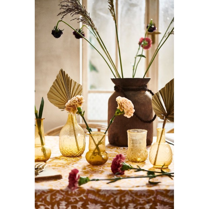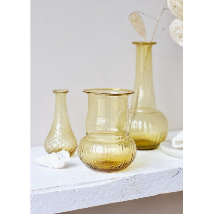 Encantador jarrón hecho a mano de vidrio reciclado en tono dorado. Los bordes imperfectos y las burbujas en el vidrio añaden carácter y textura adicional.