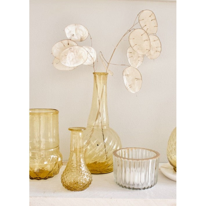 Vaso decorativo hecho a mano de vidrio reciclado en un cálido color dorado.