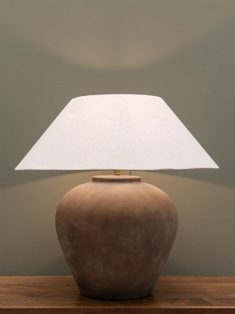 Lámpara con diseño contemporáneo y una forma atemporal. Hecha en terracota, la pantalla está hecha en lino blanco.