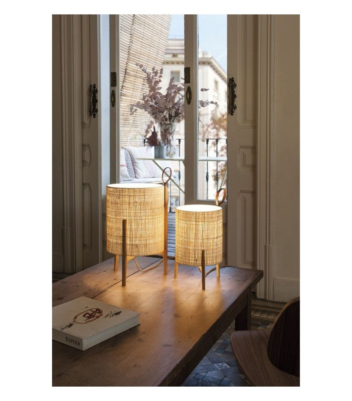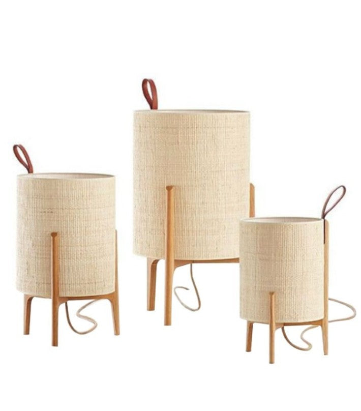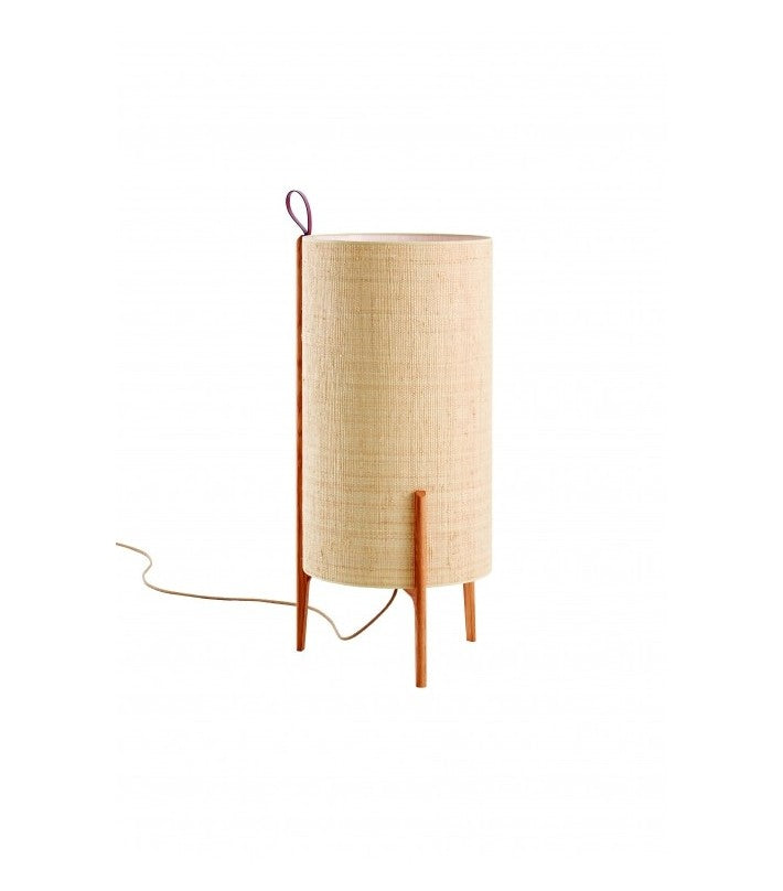 Base de madera natural de roble o roble negro. Pantalla de fibra natural o blanca. Asa de cuero natural.