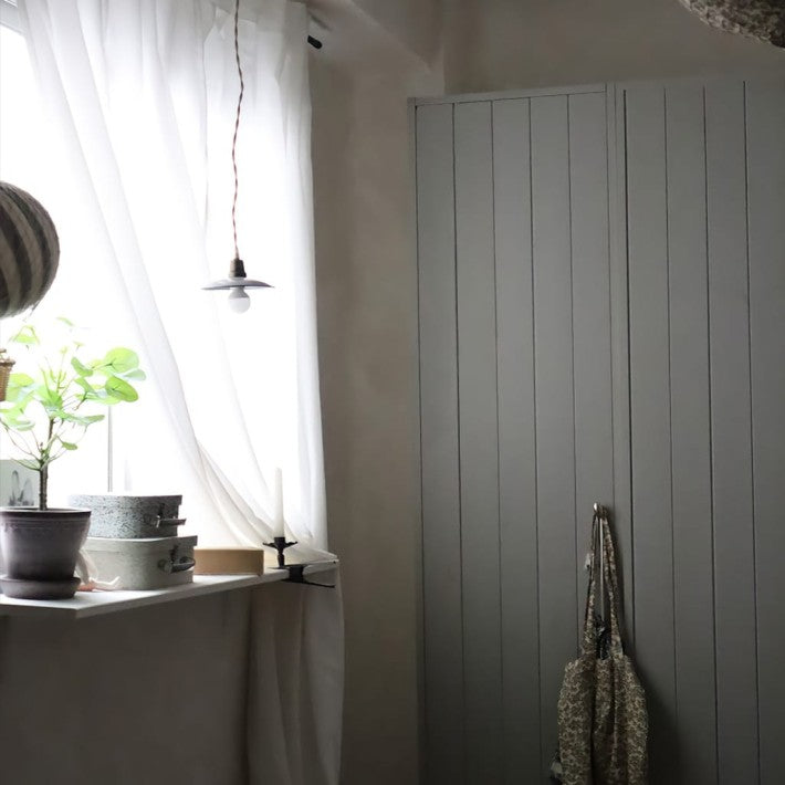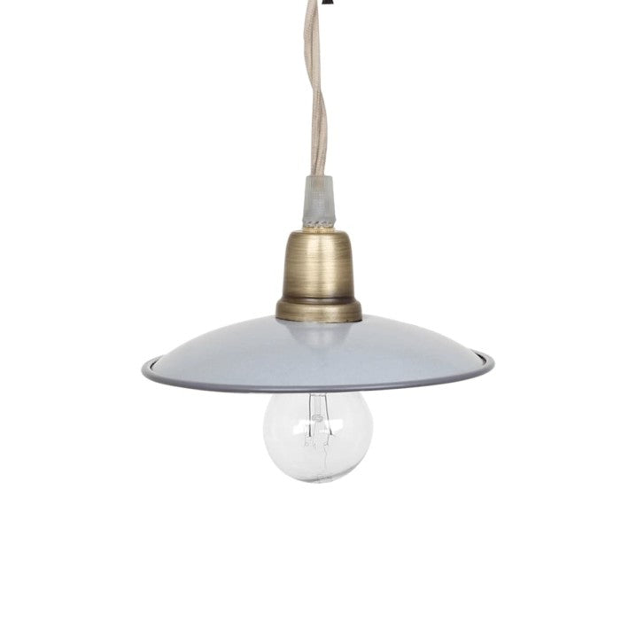 Lámpara colgante con una pantalla pequeña y redonda de color gris con un borde contrastante gris y detalles en latón. Se adapta perfectamente en una ventana, sobre la encimera de la cocina o la mesa auxiliar. Cordón textil retorcido en color beige, longitud aproximada de 150 cm.