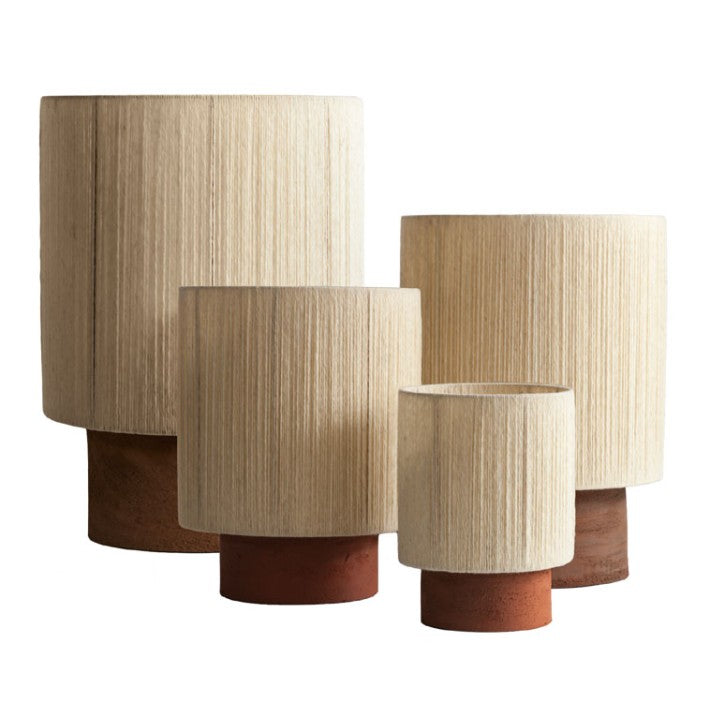 El pie está hecho de piedra arenisca de arcilla negra y su pantalla de lámpara en hilo de lana natural estirada a mano.