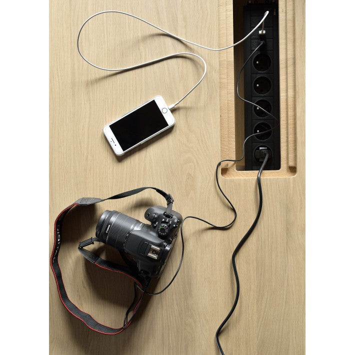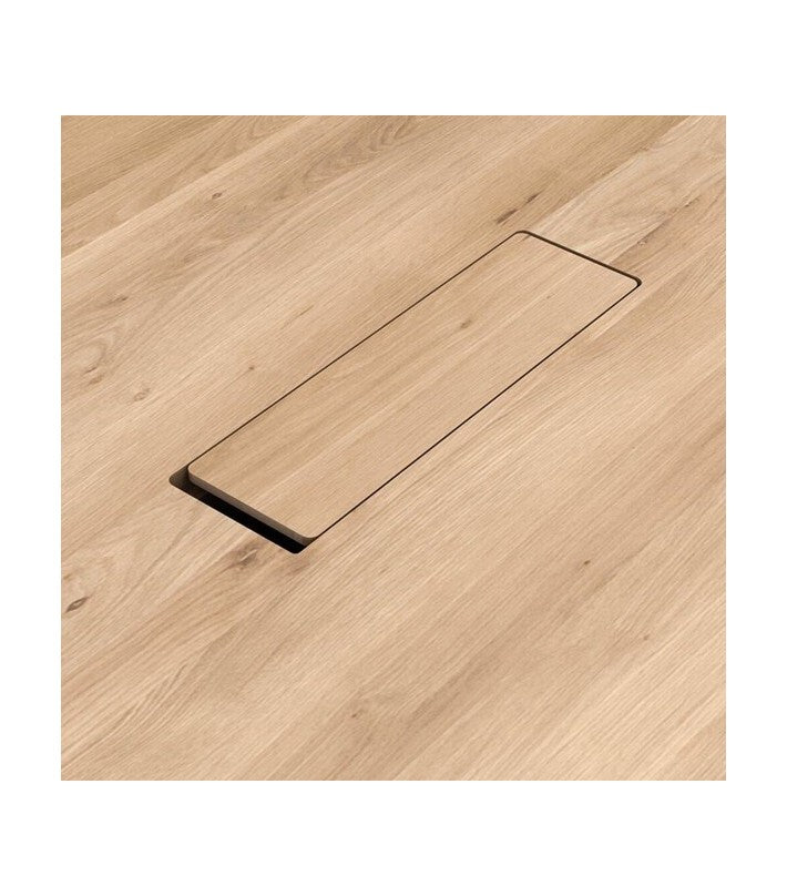 Mantenga los cables y cargadores fuera de la vista gracias a la caja de madera debajo del centro de la mesa. 100% madera de roble.