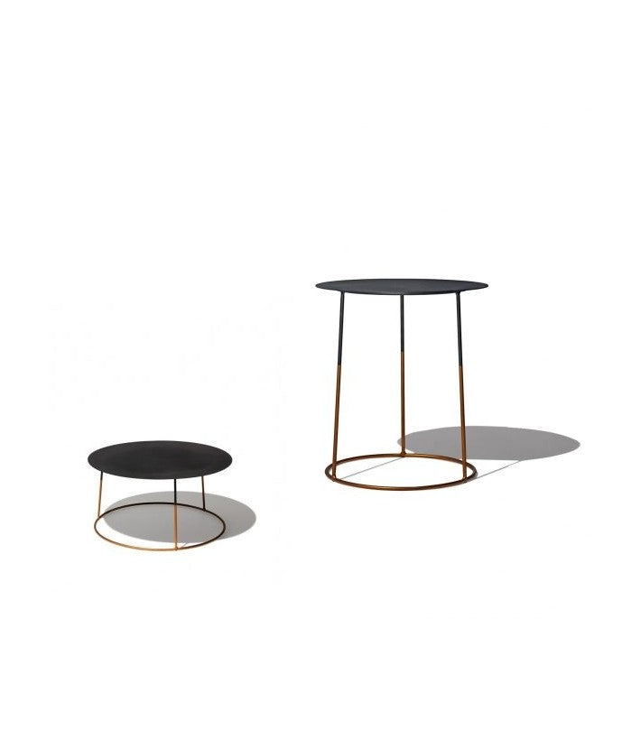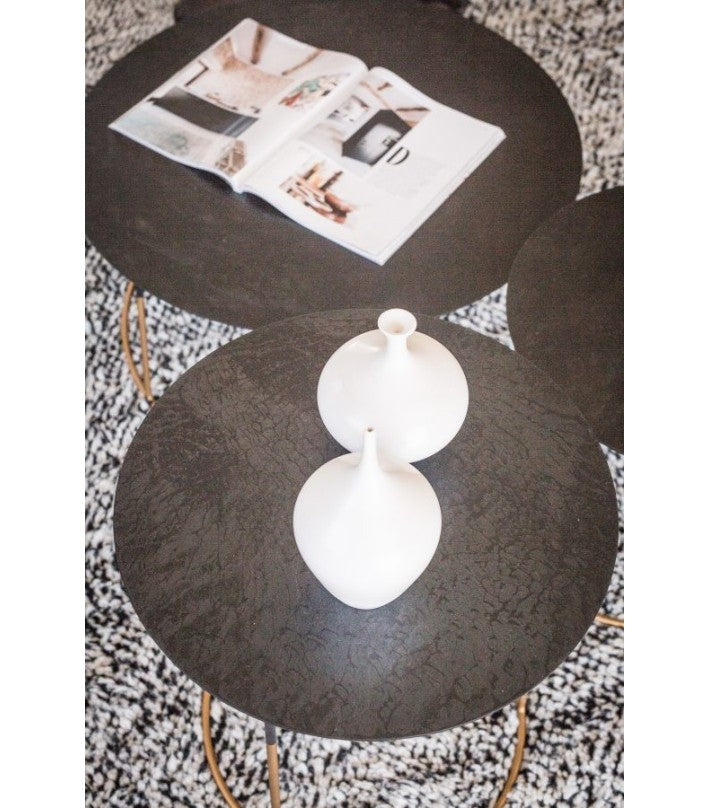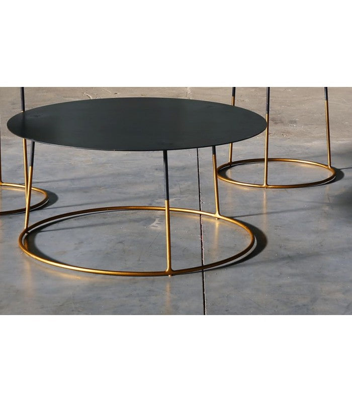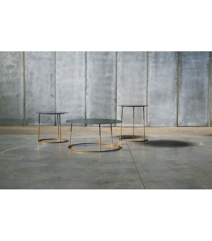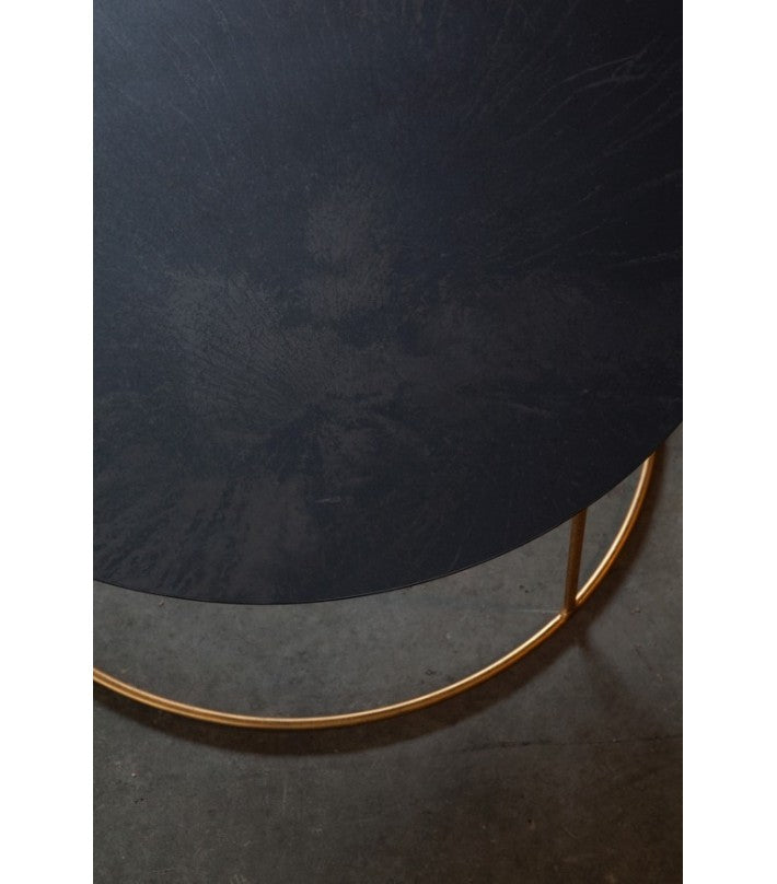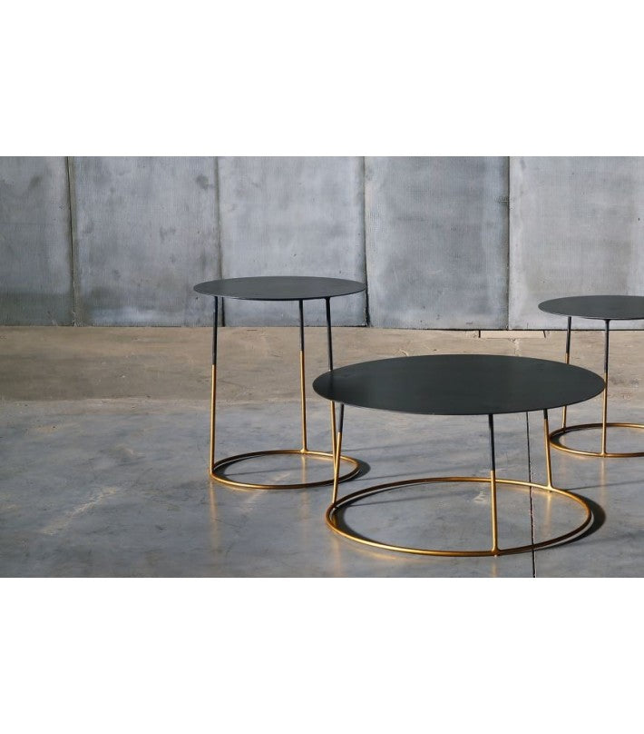 Las mesas Bimbus Gold tienen una parte superior de metal negro que está desgastada a mano, por lo que cada modelo será diferente. La parte superior está montada en un marco redondo de acero dorado. Disponible en tres tamaños distintos.