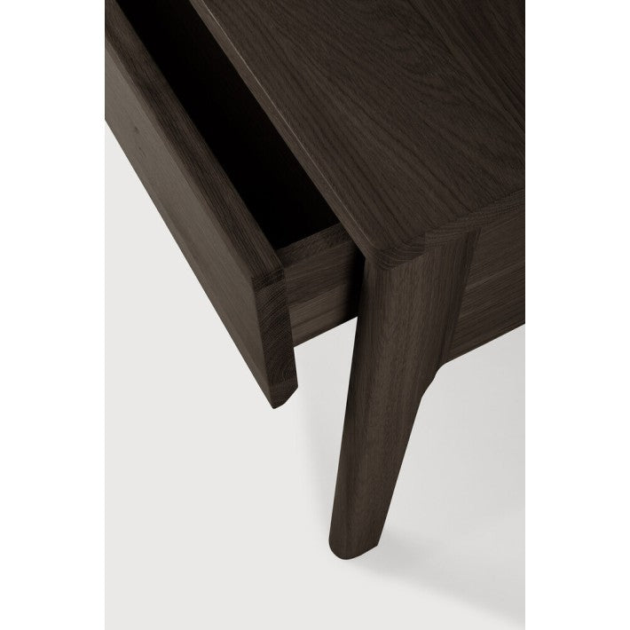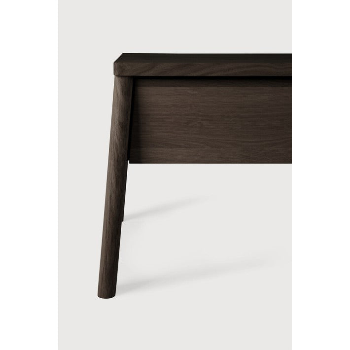 Cuenta con un cajón. De roble teñido de marrón con acabado barnizado.