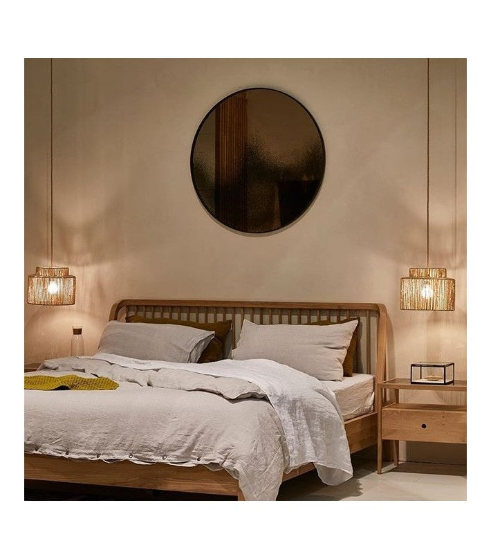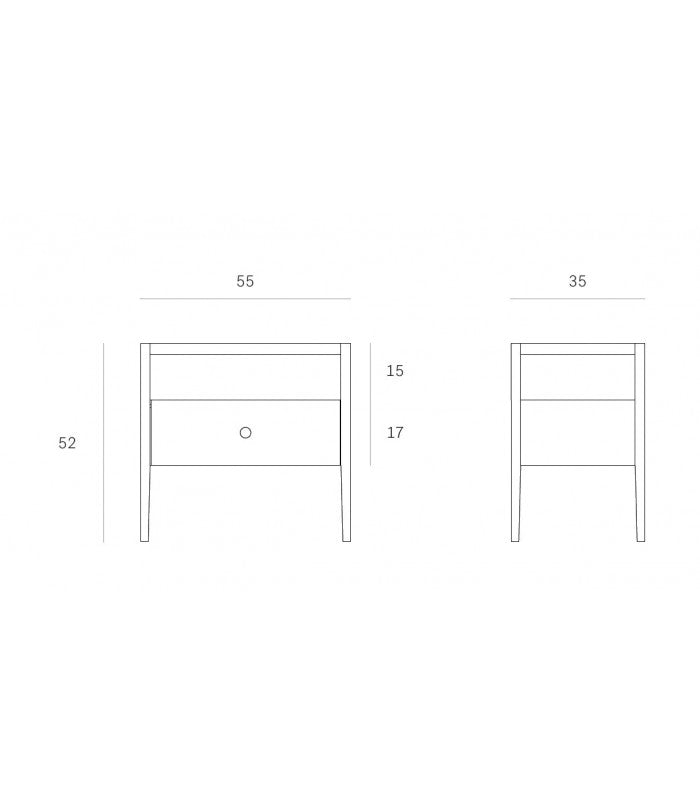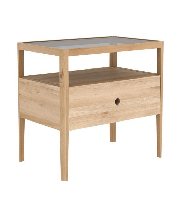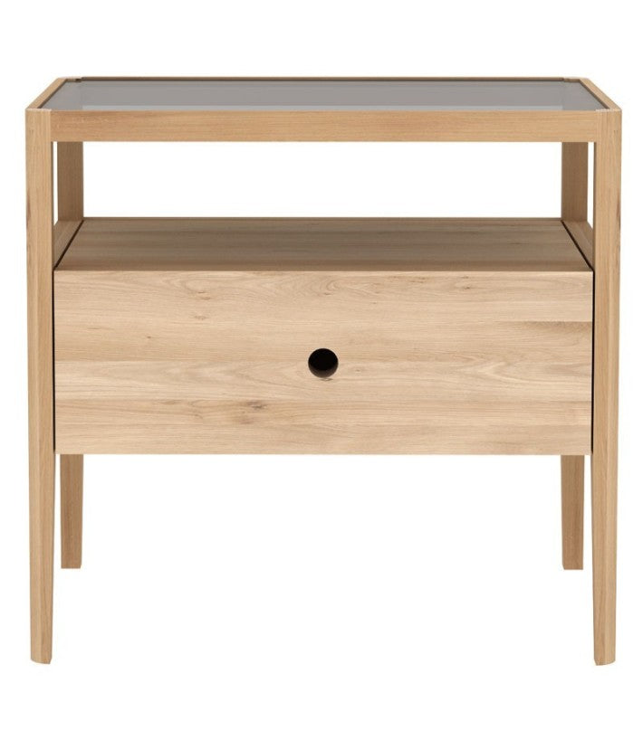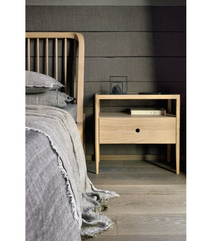 La mesita de noche Spindle de roble se puede combinar con la cama Spindle. Está compuesta por una balda de vidrio y un cajón.