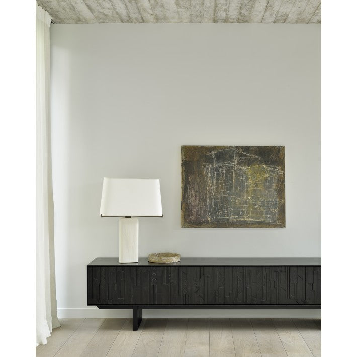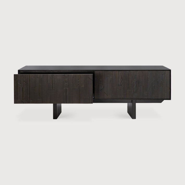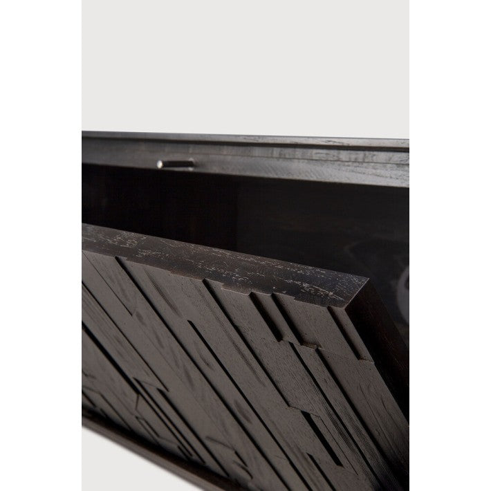El diseño de nuestro aparador de TV, con sus piezas de madera superpuestas inspiradas en los recortes de la producción en fábrica de nuestros modelos, crea un ritmo que evoca la partitura de un órgano. Profundamente influenciado por la música dentro de su proceso creativo, Alain van Havre ofrece aquí una nueva traducción de su obsesión por el movimiento.