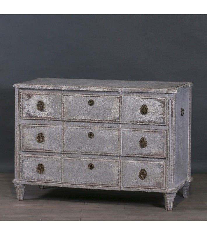 Reproducción de una cómoda de estilo gustaviano (sueco, siglo XVIII) compuesta por tres cajones de diferentes profundidades, ornamentados con tiradores y cerraduras de estilo Luis XVI.