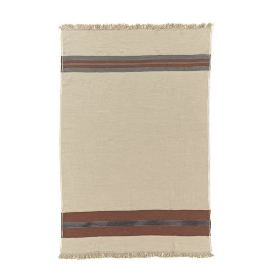 Este plaid combina la suavidad del lino lavado con la calidez de la lana para crear una pieza envolvente, con cuerpo y textura. La mezcla de tonos marrón siena tostado, carbón y negro forma un patrón sutil de franjas horizontales en los extremos y en el centro, que aporta profundidad visual sin perder sobriedad.