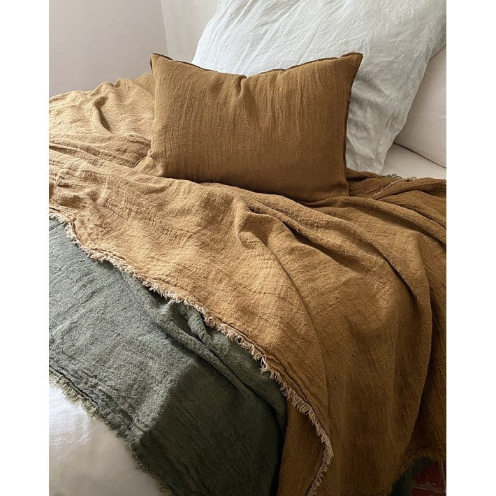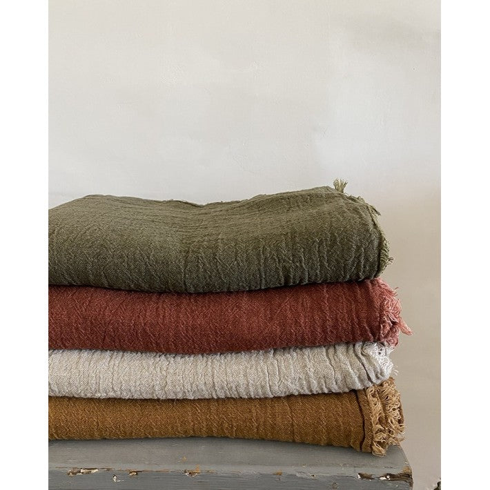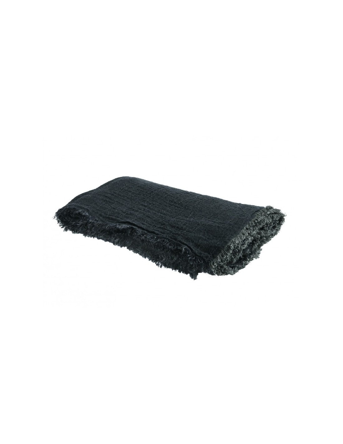 Maravilloso plaid de lino con flecos de la firma francesa Maison de Vacances. Este producto es una tela de crespón de lino lavado de alta calidad, confeccionada con hilo de dos tonos y con cuatro bordes con flecos.