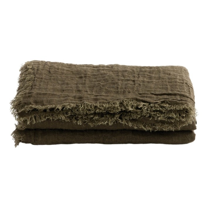 Maravilloso plaid de lino con flecos de la firma francesa Maison de Vacances. Este producto es una tela de gasa de lino lavado de alta calidad, confeccionada con hilo de dos tonos y con cuatro bordes con flecos. Viene en dos tamaños: 150 x 250 cm y 150 x 300 cm, y está hecho en Francia.