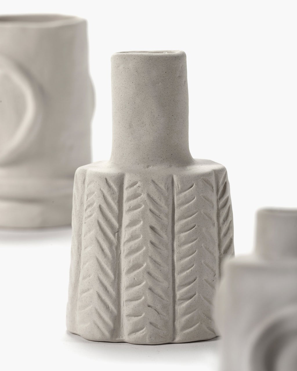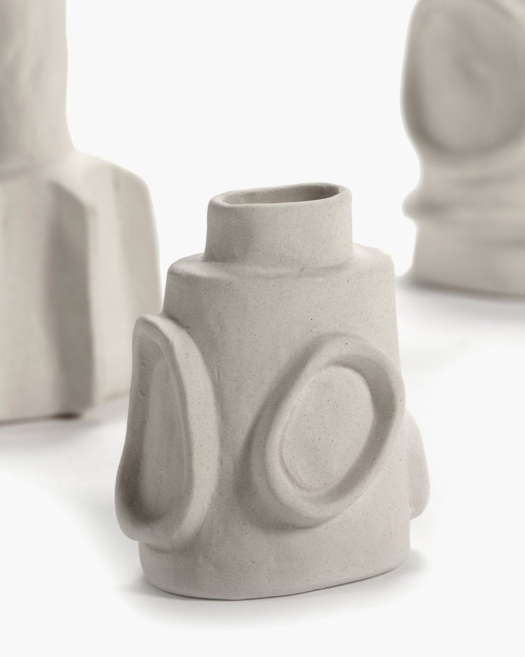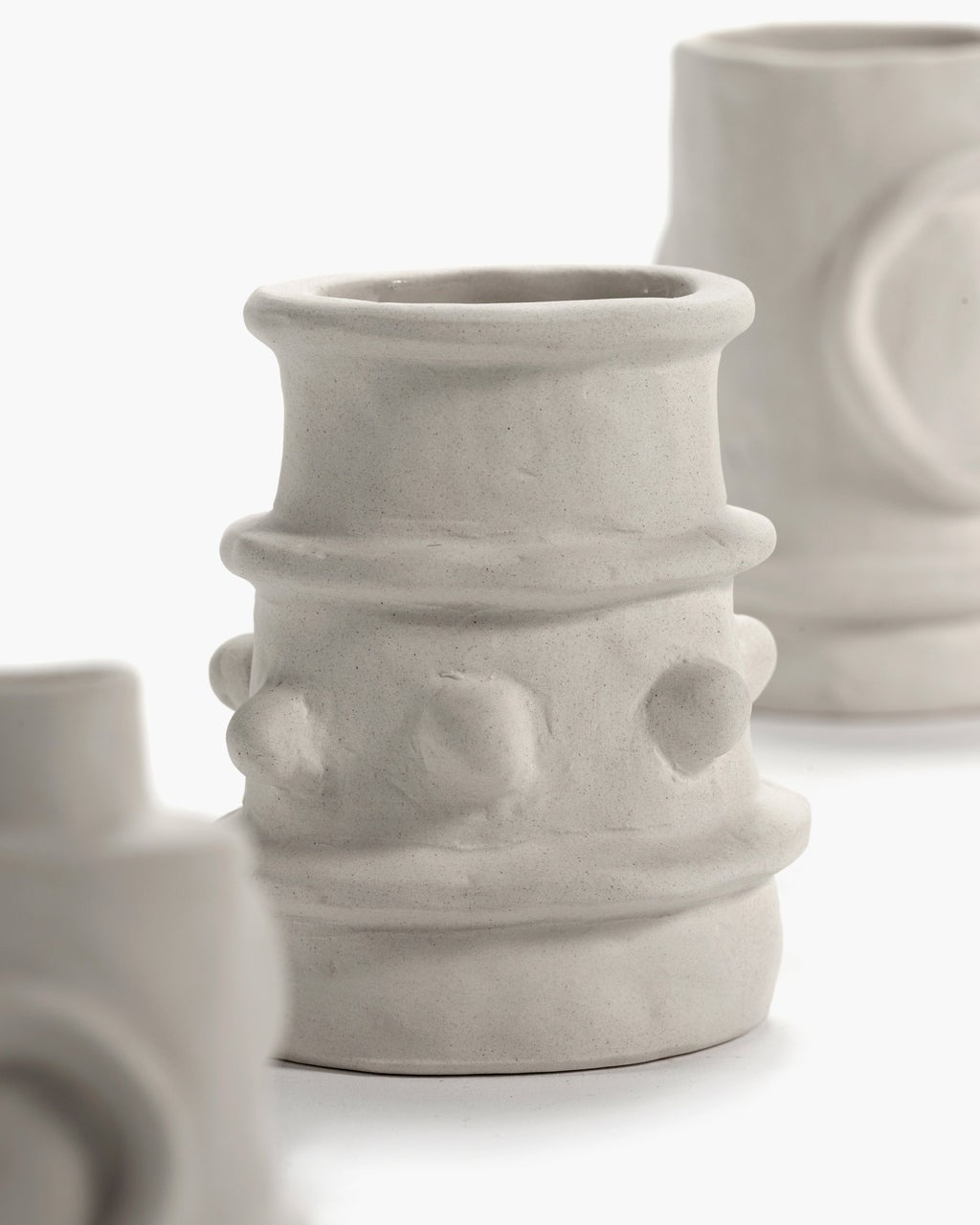 Conjunto de 6 piezas. Realizadas en gres de color blanco roto, con acabado mate en el exterior y esmaltado en el interior, estas jarras y macetas Molly son un llamativo elemento gráfico en cualquier interior.