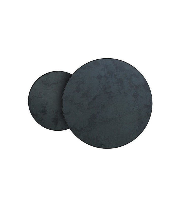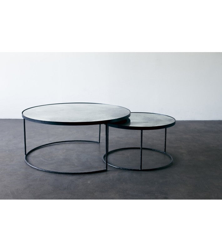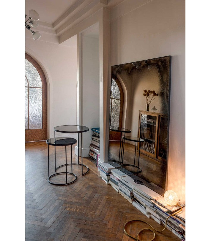 Este set de mesas captura la belleza del entorno en su superficie reflectante. Los espejos envejecidos de los sobre nos llevan a tiempos pasados, mientras que sus estructuras metálicas nos transportan a tiempos modernos.