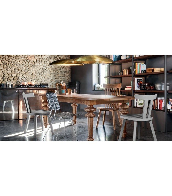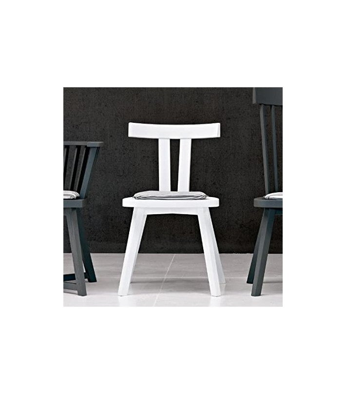 Silla con estructura en nogal o roble. Diferentes acabados de madera disponibles: lacado natural nogal americano / roble; blanco, gris, azul de la fuerza aérea, roble lacado negro. Cojín de asiento opcional en diferentes tejidos con espumas de poliuretano.