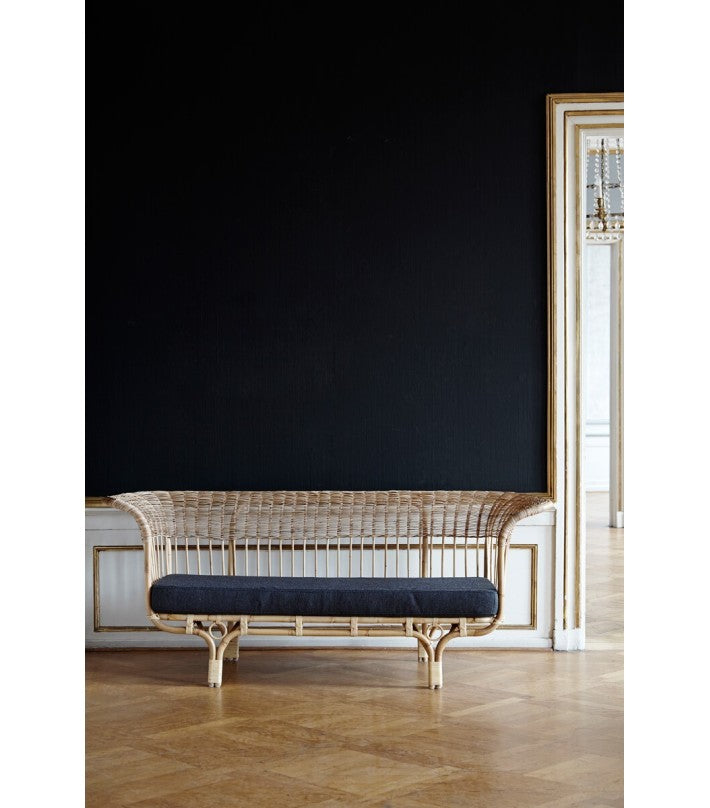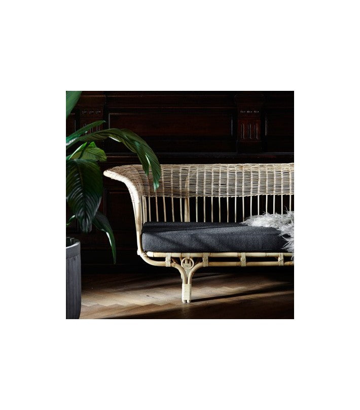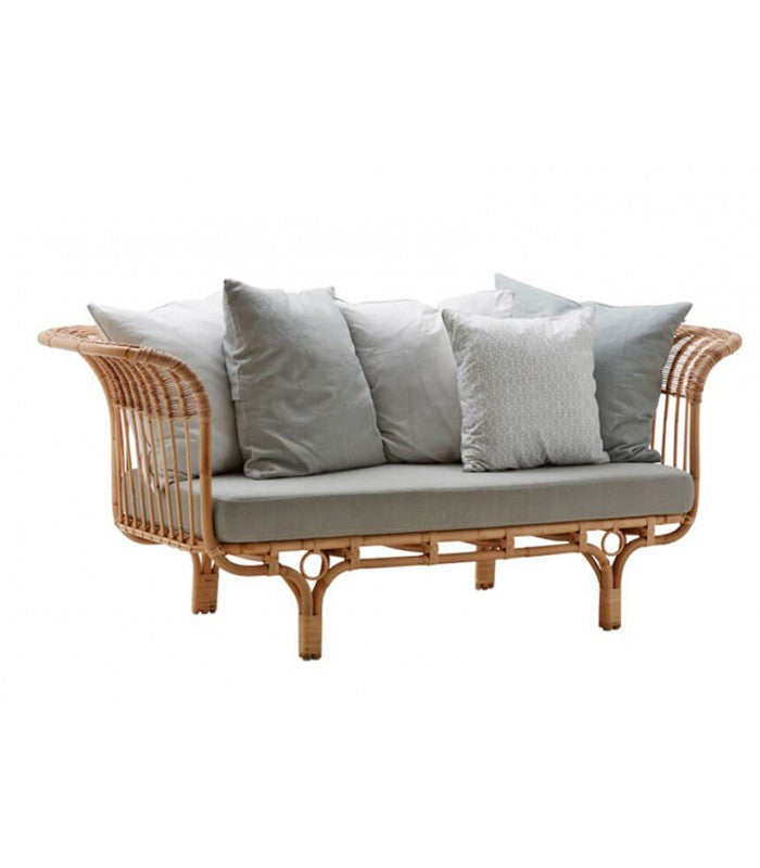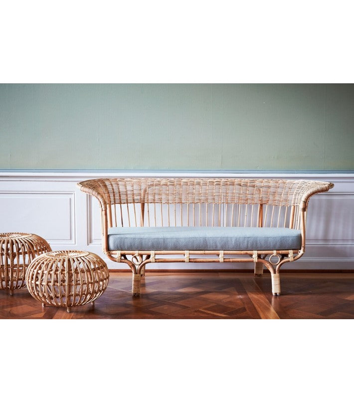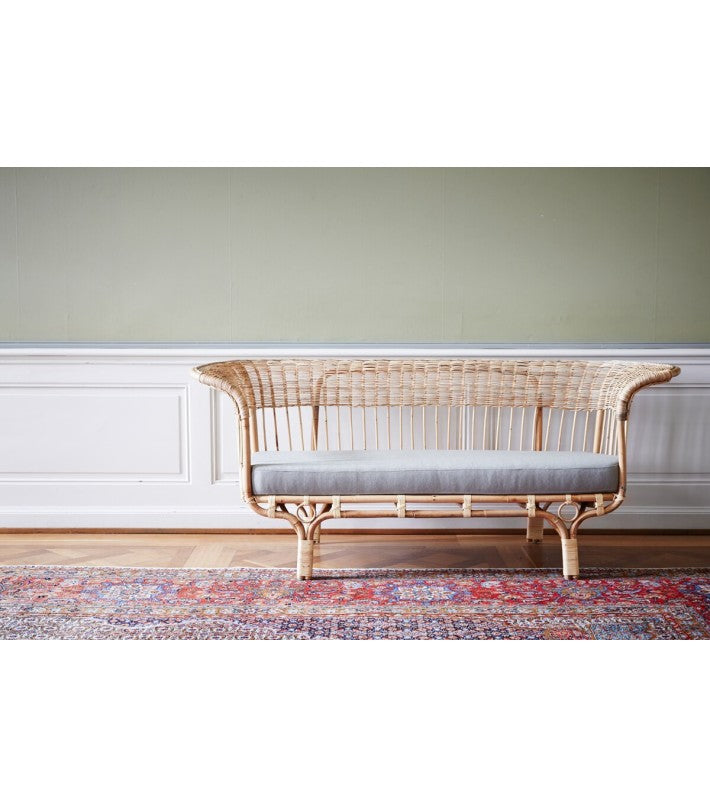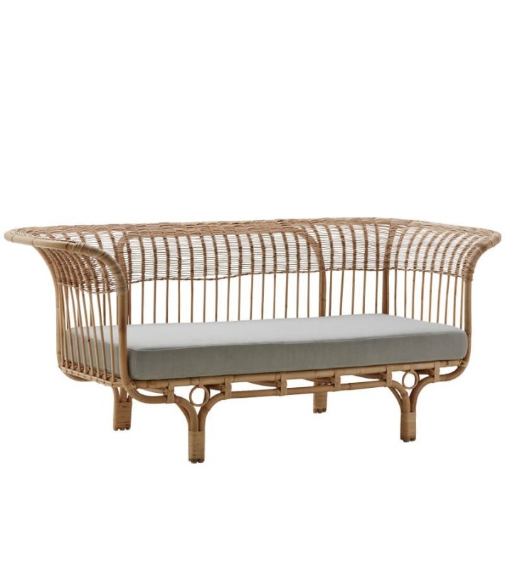 Este sofá está hecho de ratán natural y es posible comprar cojines.