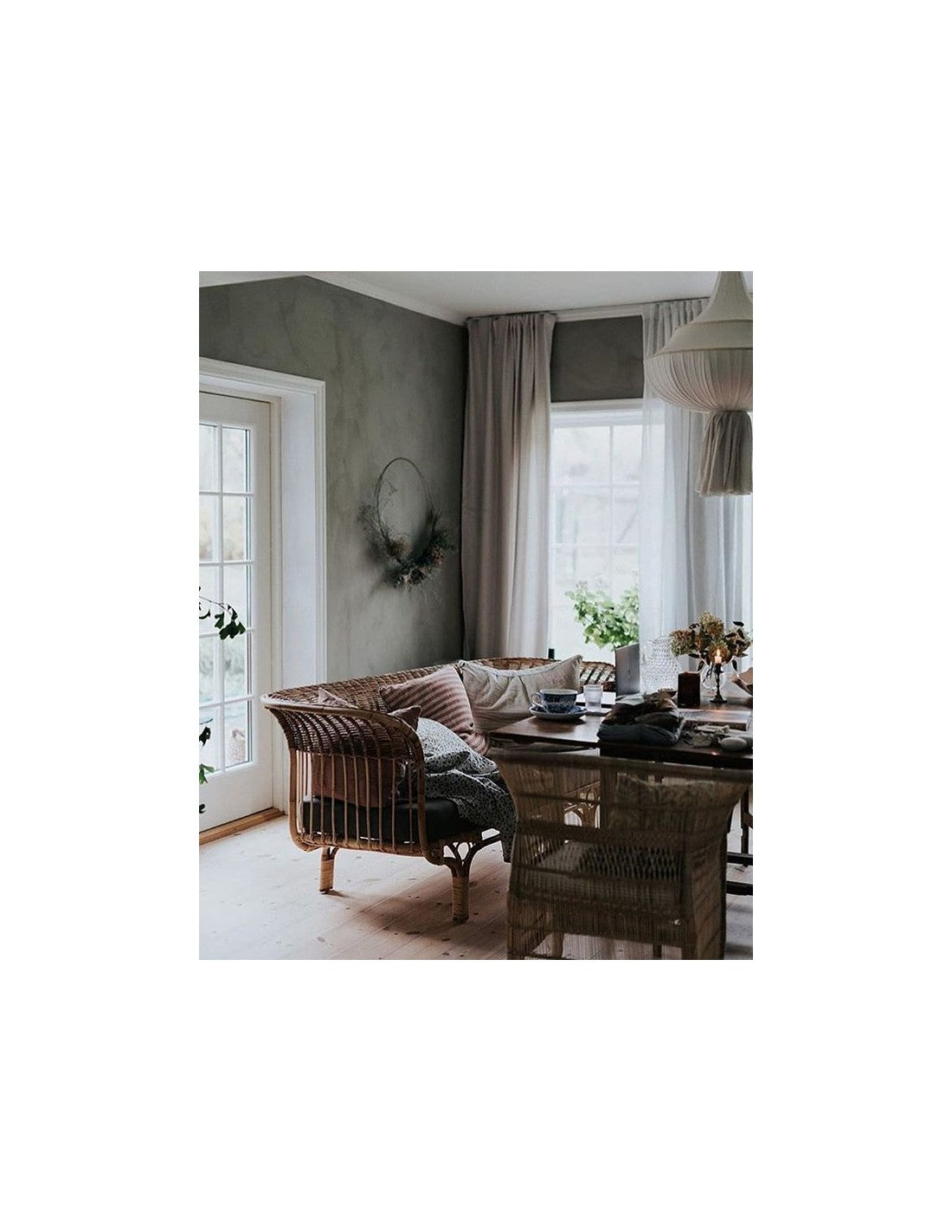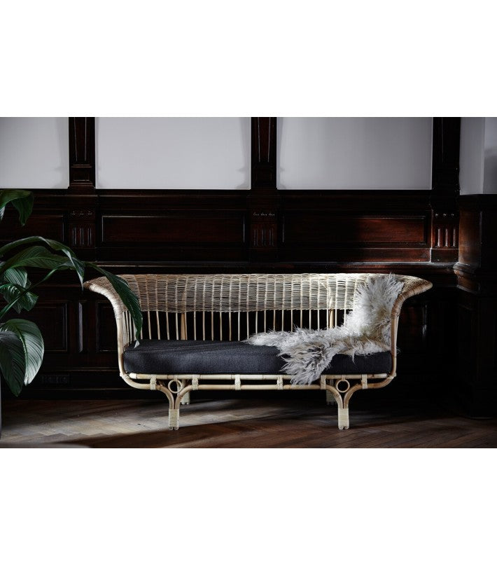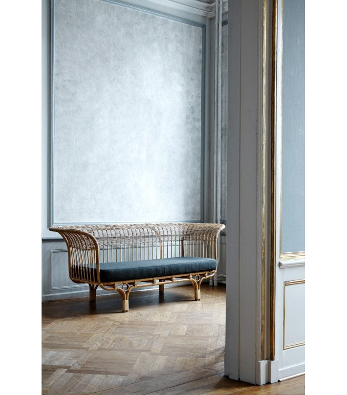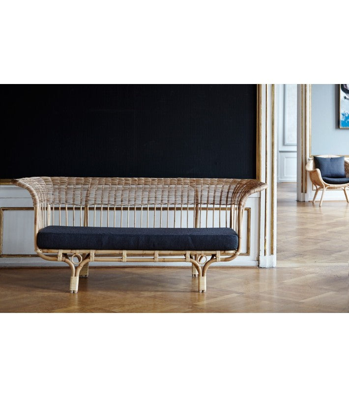 Este sofá está hecho de ratán natural y es posible comprar cojines.