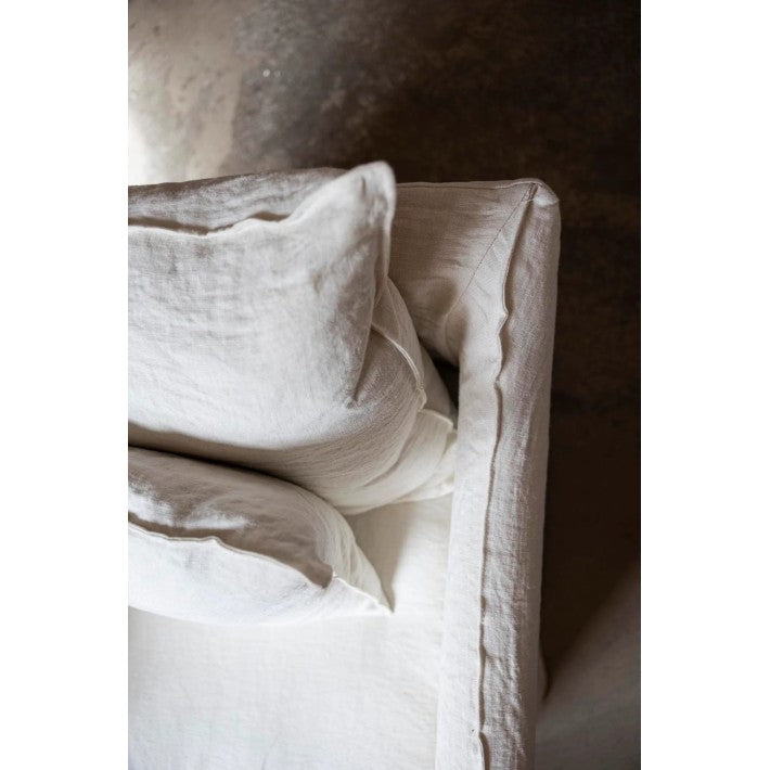 Sofá Cloud de Nomad Home. Cuando la pureza del lino se encuentra con la comodidad de las plumas. La costura pellizcada le da un carácter único al producto. Cuando la tela le da el estilo a tu sofá, apuesta por este lino en color blanco.