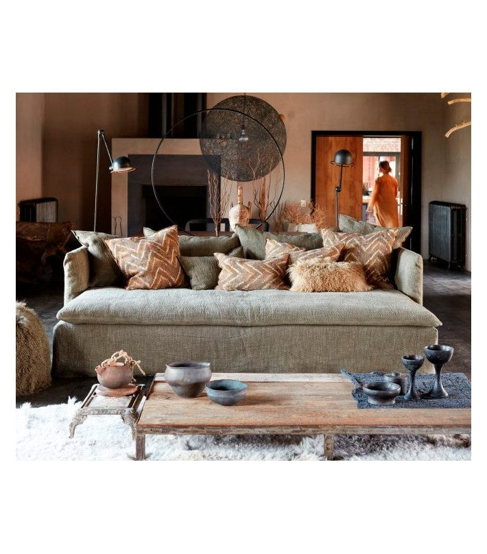 Funda de lino lavado 100%, totalmente desenfundable. Los almohadones no están incluidos, recomendamos los almohadones Formentera de 65x65cm y de 40x60cm.