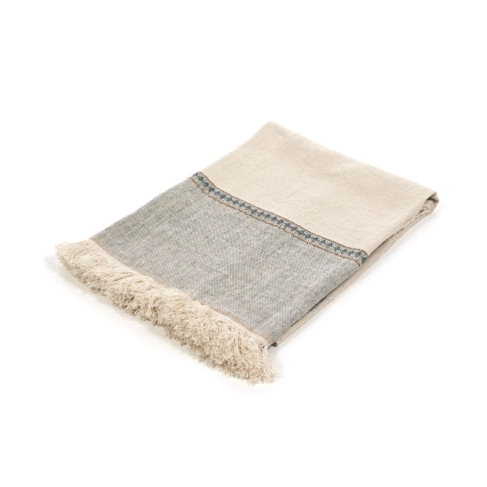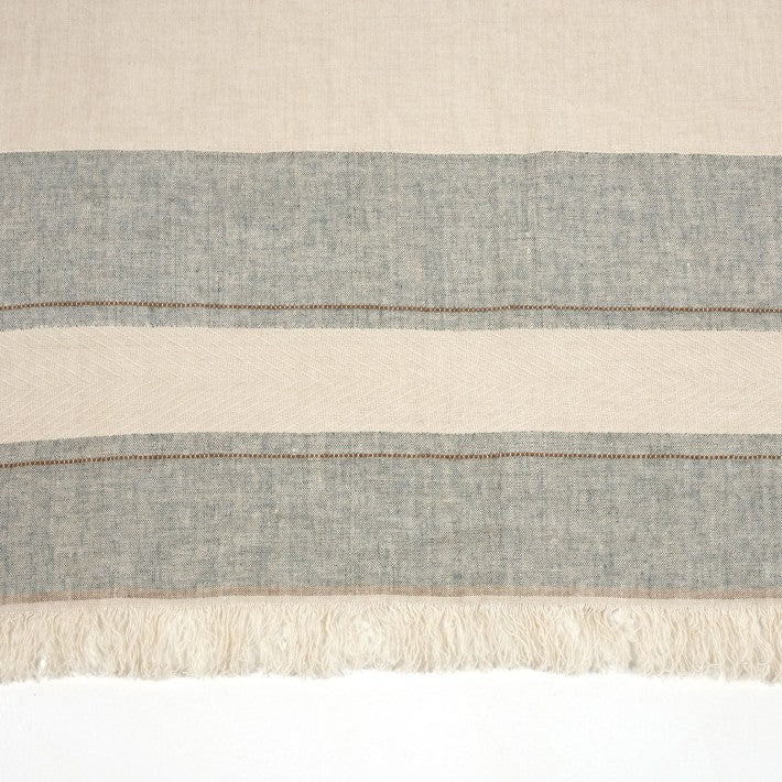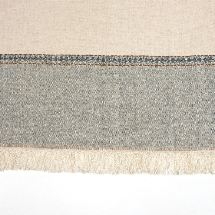 Hay dos franjas diferentes que se sientan en ambos extremos del fondo de color lino, ambas franjas presentan colores cuero, verde abeto y mostaza. Está terminado con flecos en ambos extremos.