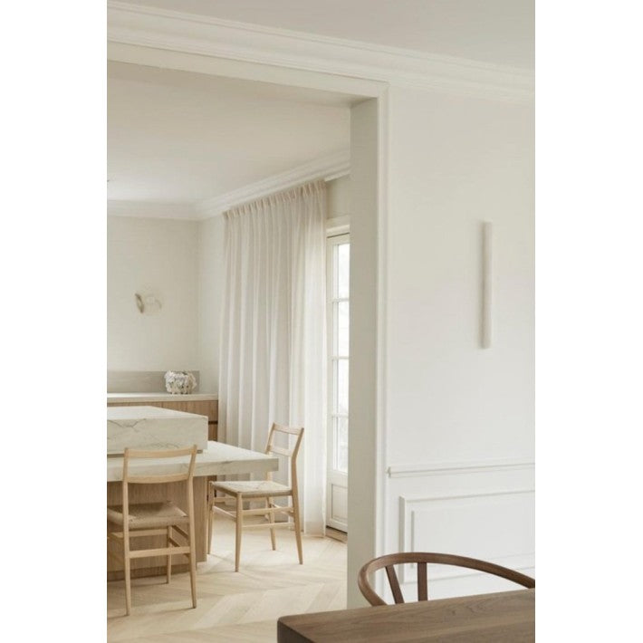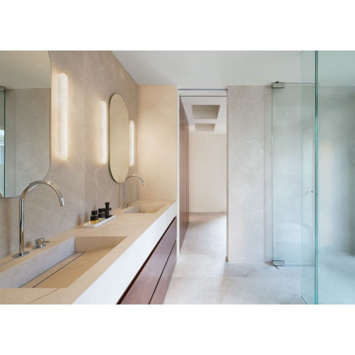 El aplique de pared 65 es una luminaria de líneas puras y estética contemporánea, elaborada a partir de una sola pieza de alabastro natural. Su forma tubular estilizada (65 cm de largo y solo 4 cm de ancho) lo convierte en una opción ideal para espacios que buscan una iluminación decorativa sutil pero con carácter.